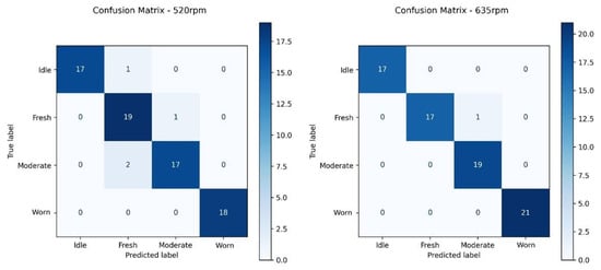 Confusion matrices for both 520 rpm and 635 rpm.