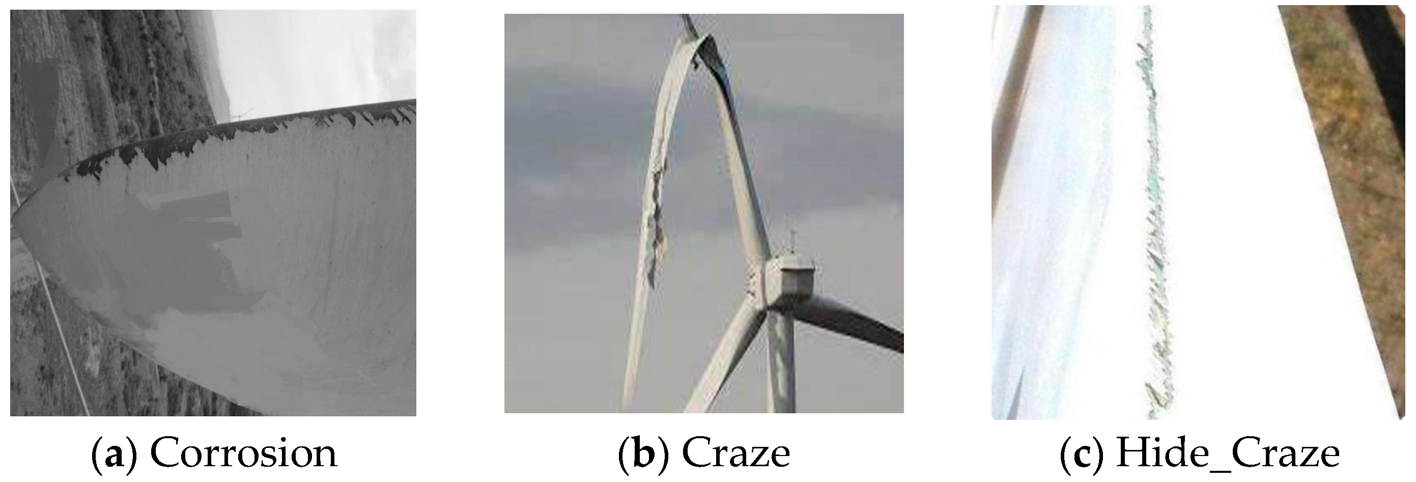 3]. However, identifying surface defects—such as corrosion, craze, and thunderstrike—remains highly challenging due to their diverse visual patterns, varying scales, and sensitivity to weather and lighting conditions. Such defects can degrade aerodynamic performance, accelerate material fatigue, and ultimately lead to unexpected turbine shutdowns or costly maintenance operations. Therefore, early and accurate blade defect detection is essential to ensure the reliability, durability, and economic viability of wind power assets.