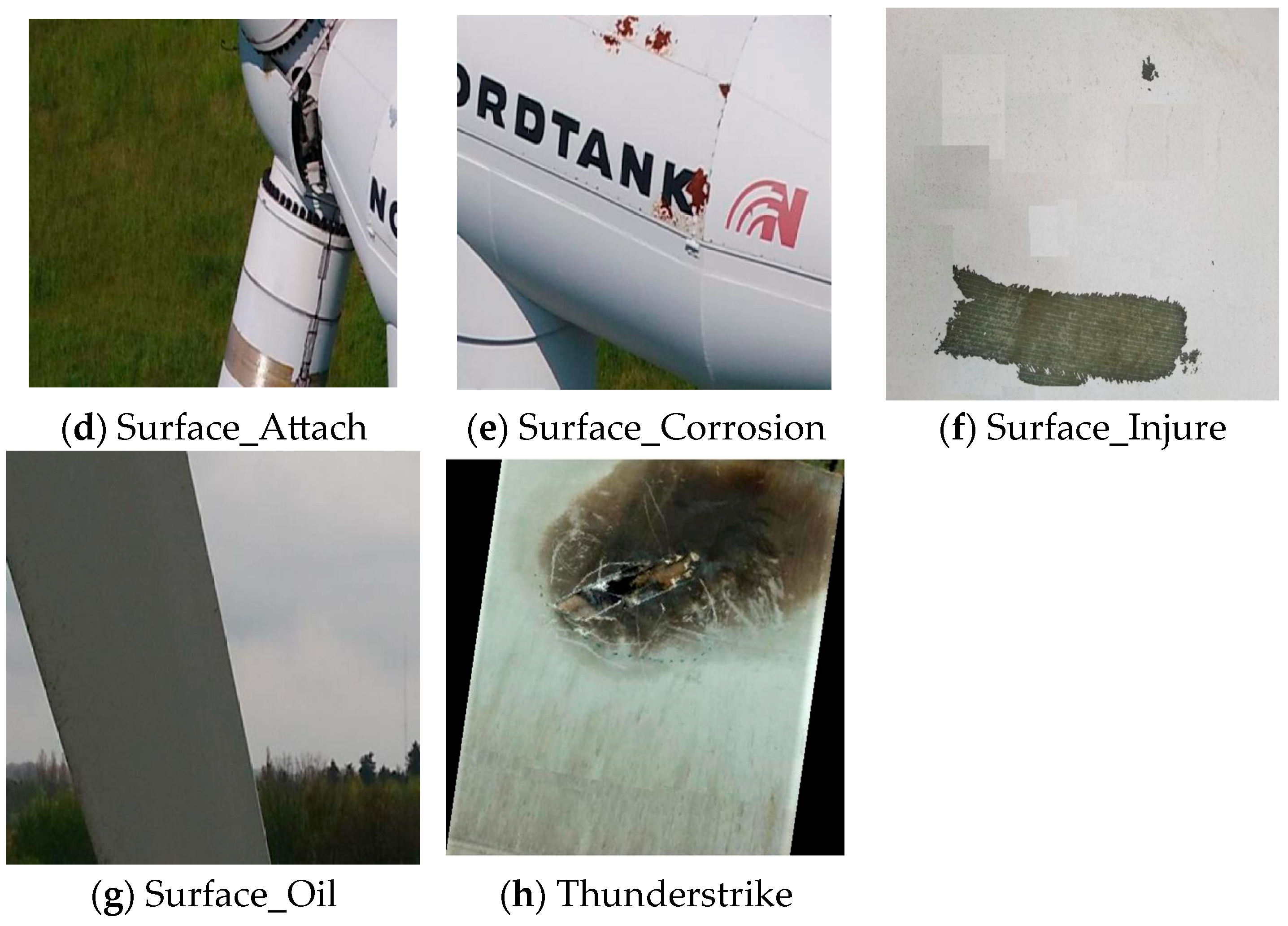 These subfigures correspond to the dataset’s eight labeled classes: (a) Corrosion, (b) Craze, (c) Hide_Craze, (d) Surface_Attach, (e) Surface_Corrosion, (f) Surface_Injure, (g) Surface_Oil, (h) Thunderstrike.