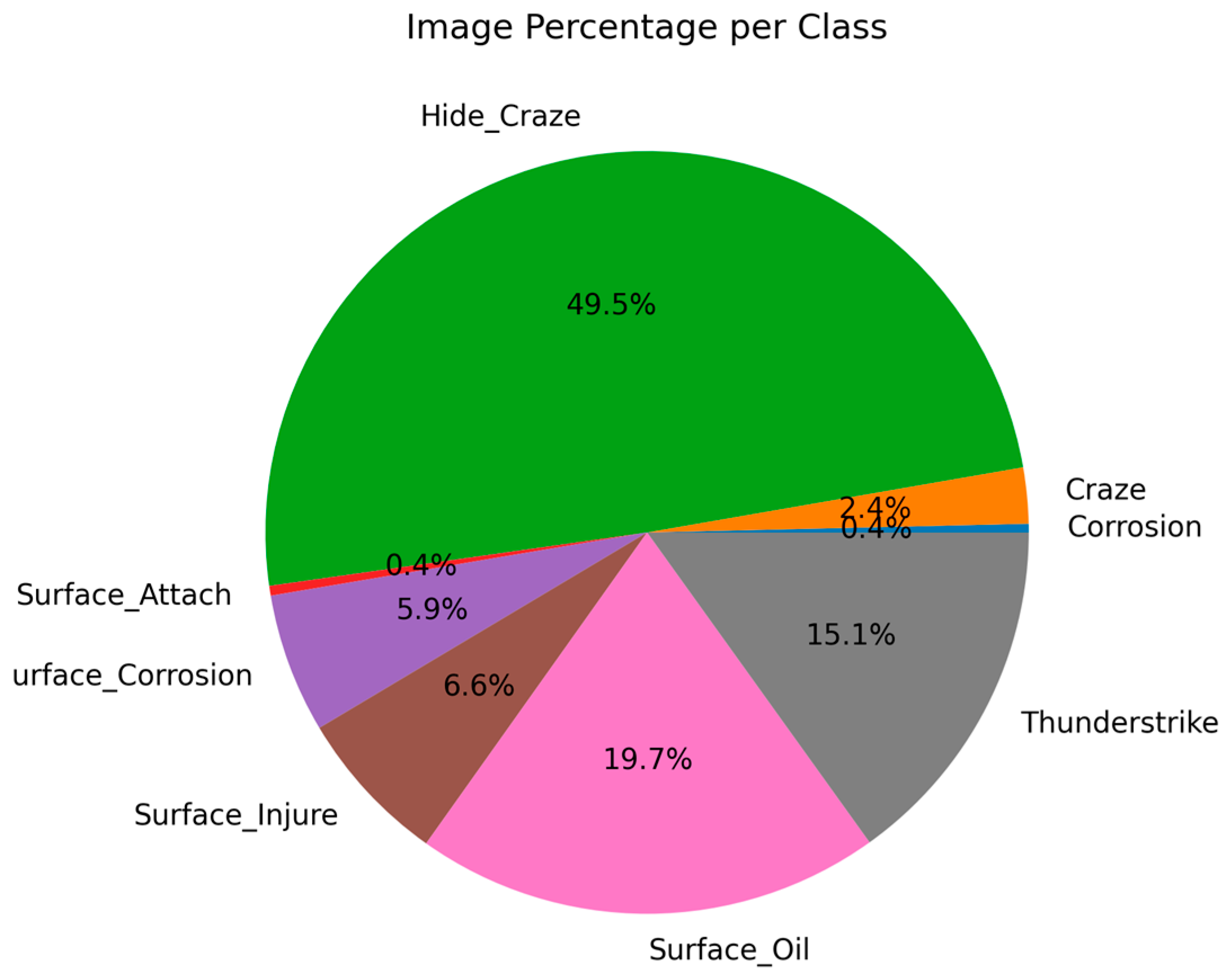 Figure 2, Hide_Craze accounts for approximately half of all images (49.5%), indicating that this type of sub-surface defect is dominant in the dataset. Surface_Oil and Thunderstrike represent 19.7% and 15.1%, respectively, while other categories such as Surface_Corrosion, Surface_Injure, and Craze_Corrosion occupy smaller portions.