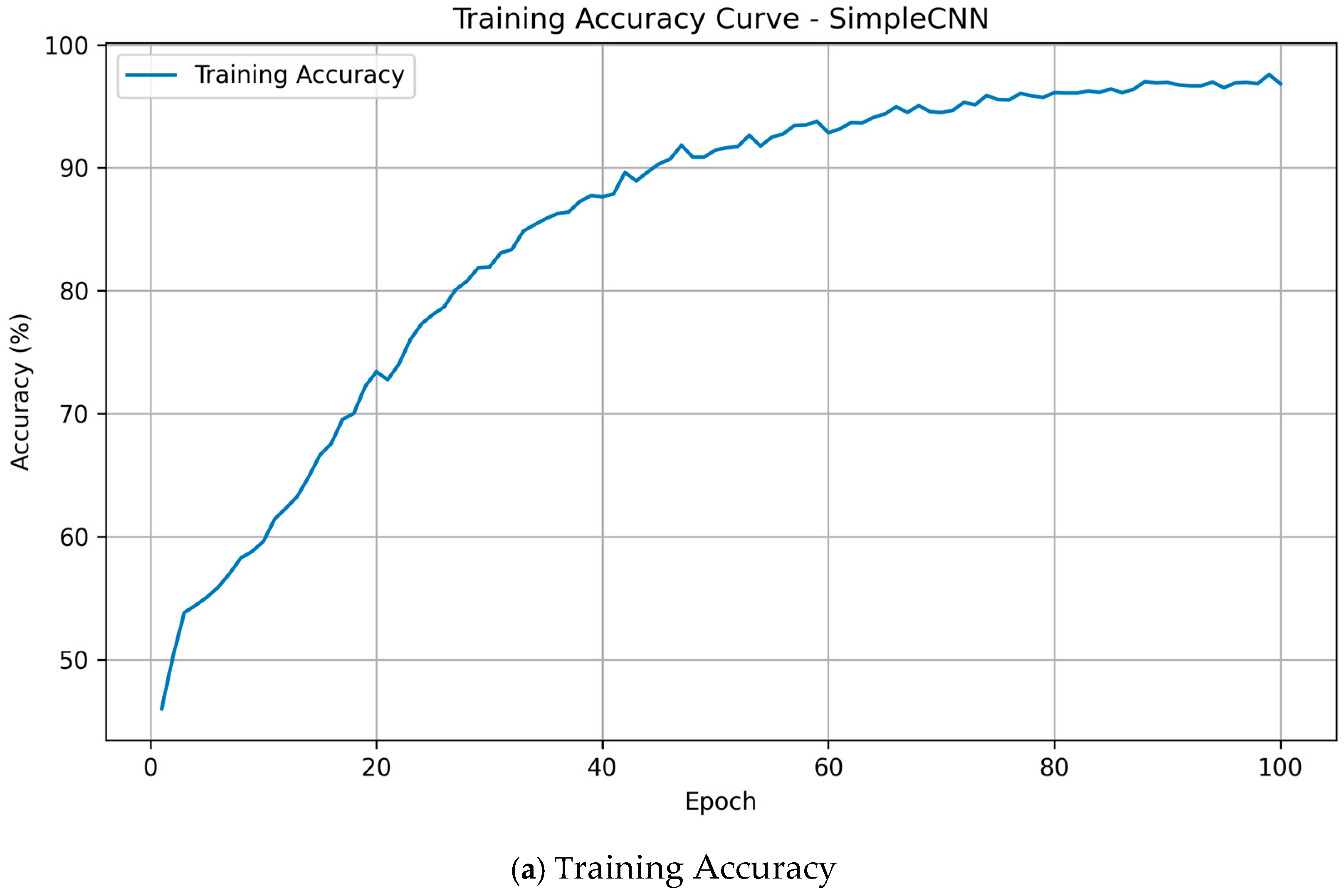 Figure 3a, the training accuracy increases steadily from 46% to 97%, demonstrating effective learning and stable convergence without oscillations. Meanwhile,