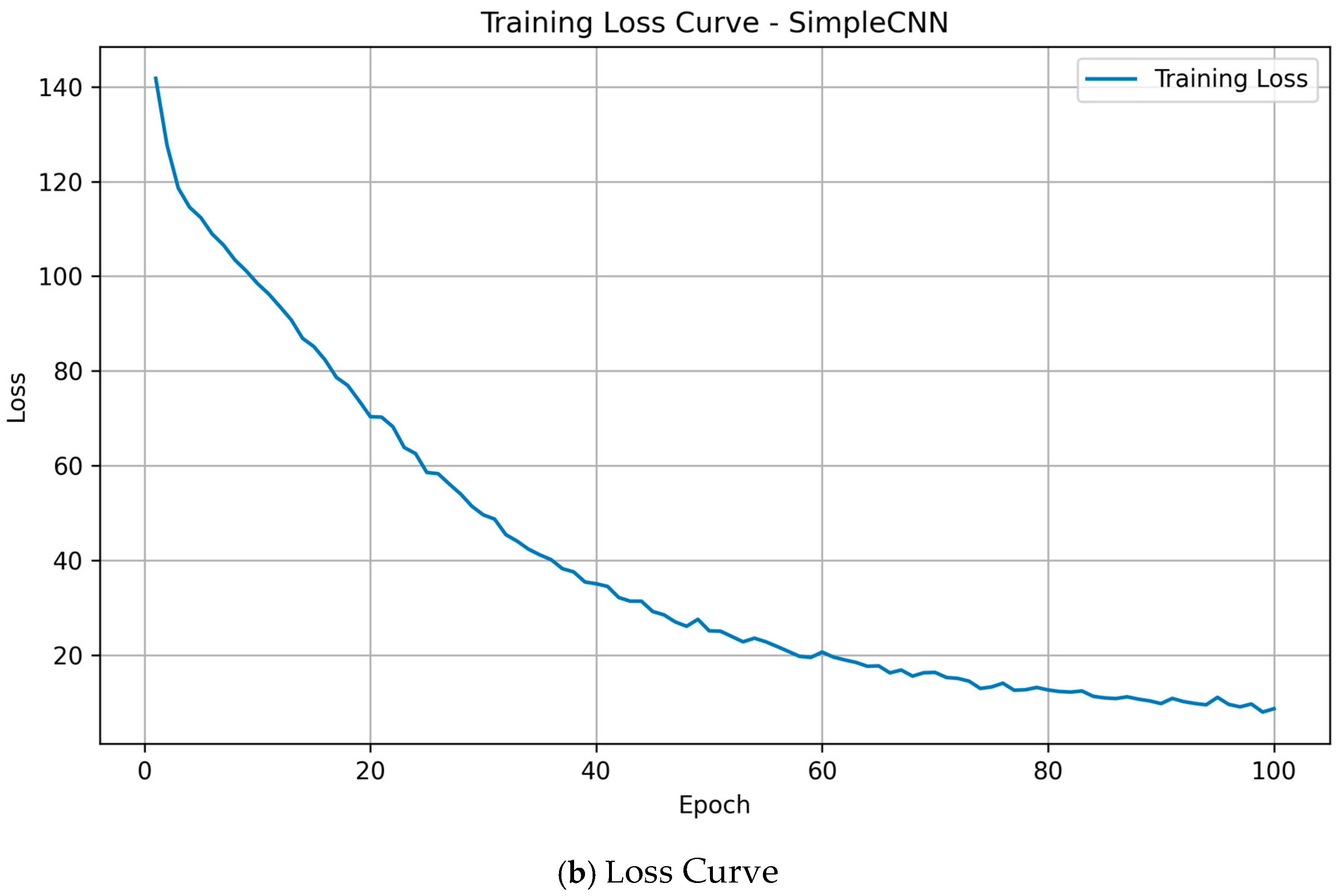 Figure 3b shows that the training loss decreases smoothly from 141.7 to 8.7, indicating consistent gradient updates and the absence of overfitting throughout training. These observations confirm that the SimpleCNN model undergoes a stable optimization process and achieves reliable convergence before quantitative evaluation.
