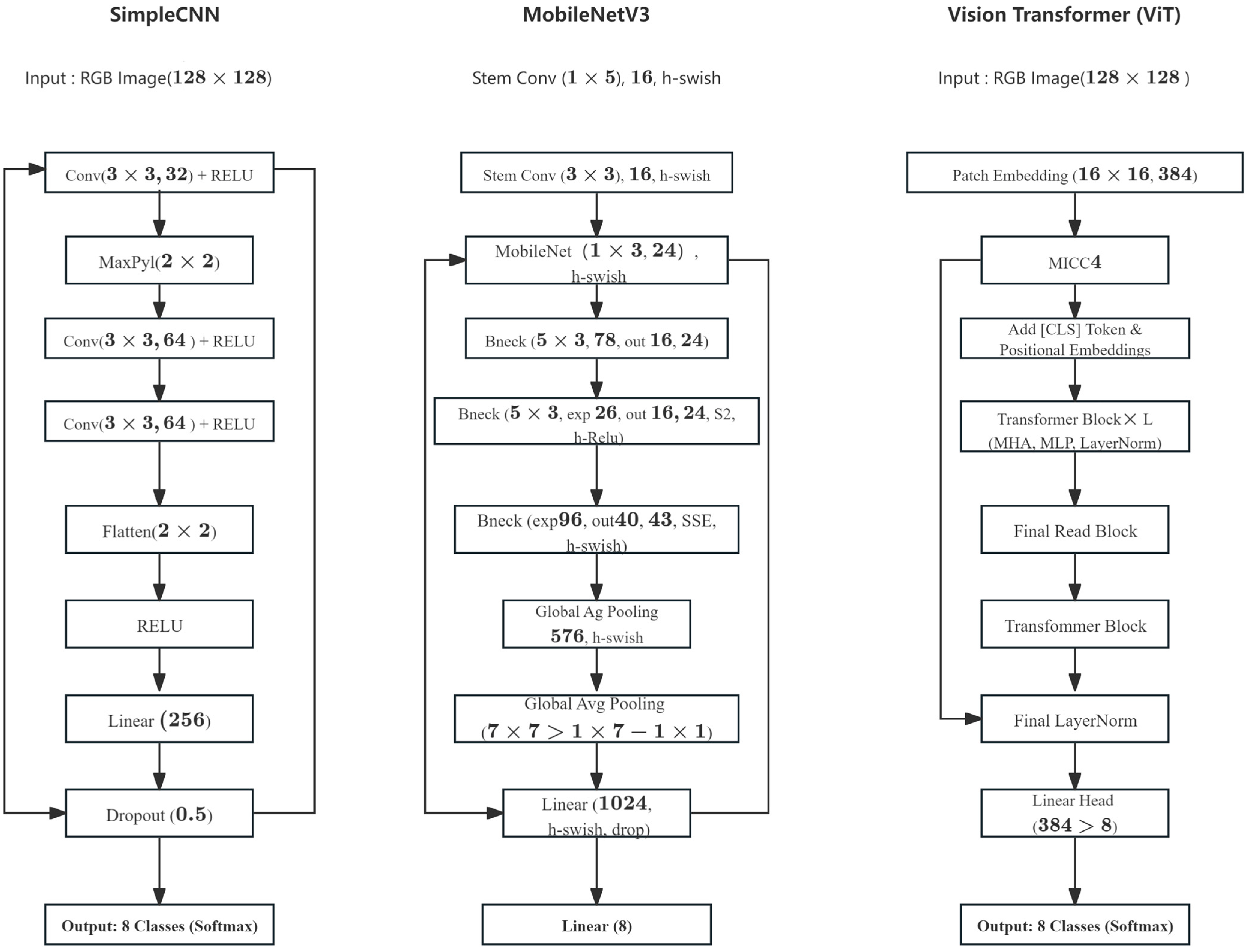 A schematic comparison of SimpleCNN, MobileNetV3, and ViT has been added to enhance architectural interpretability and clarify structural differences among the models.