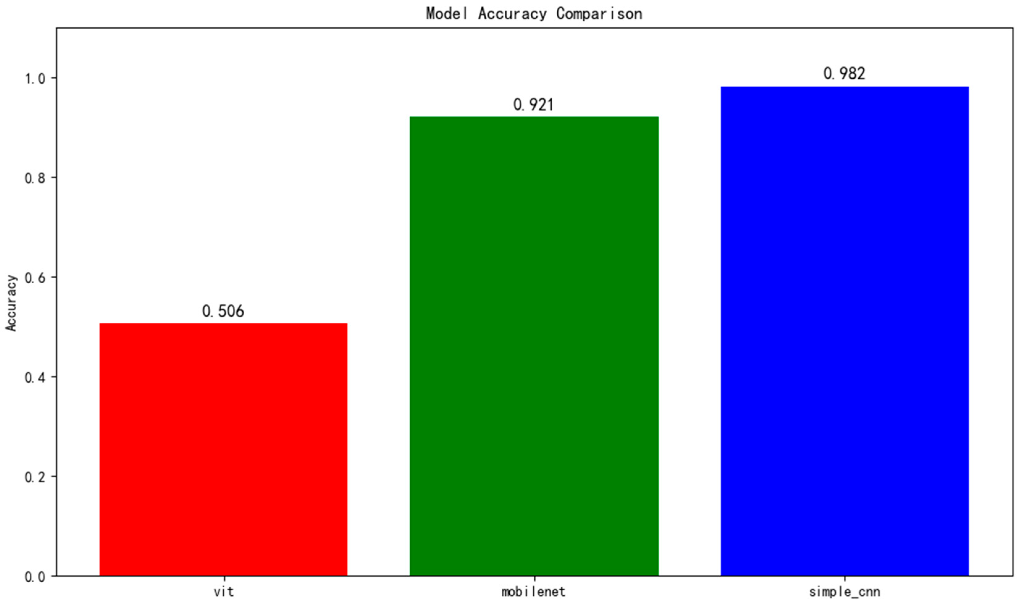 Figure 5, SimpleCNN achieved the highest accuracy, clearly outperforming MobileNetV3 and ViT. The margin between SimpleCNN and MobileNetV3 was modest, while ViT lagged significantly behind. This performance gap further supports the conclusion that lightweight CNNs are more effective for industrial datasets with limited labeled samples.