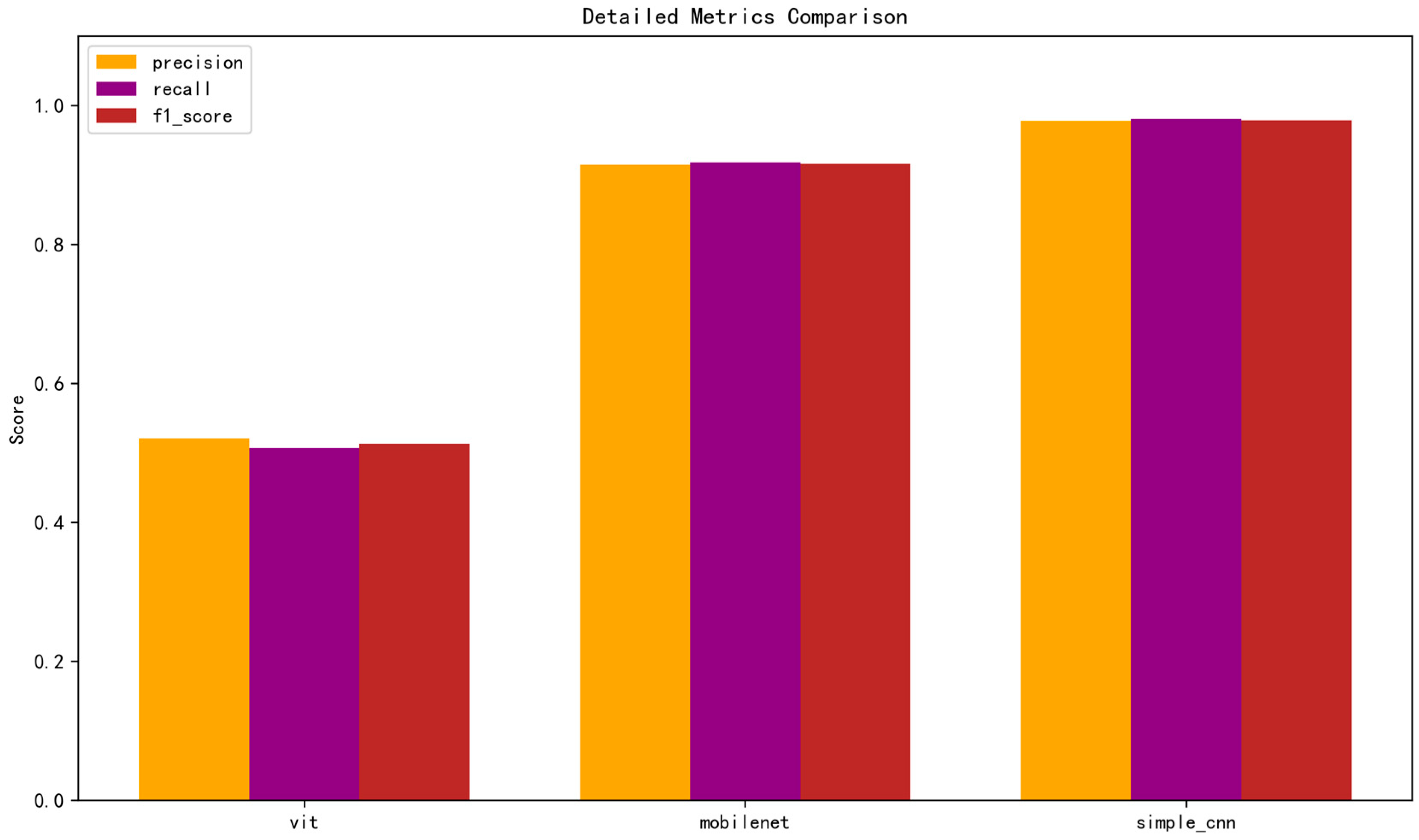 Figure 6, SimpleCNN achieved the highest performance across all three metrics, with values close to 1.0, confirming its robustness and balanced detection ability. MobileNetV3 also performed well, with slightly lower but still consistent values. In contrast, ViT demonstrated substantially weaker results, with precision, recall, and F1-scores clustered around 0.5. Such results indicate that ViT struggles to generalize effectively when the dataset is limited and class distribution is uneven.