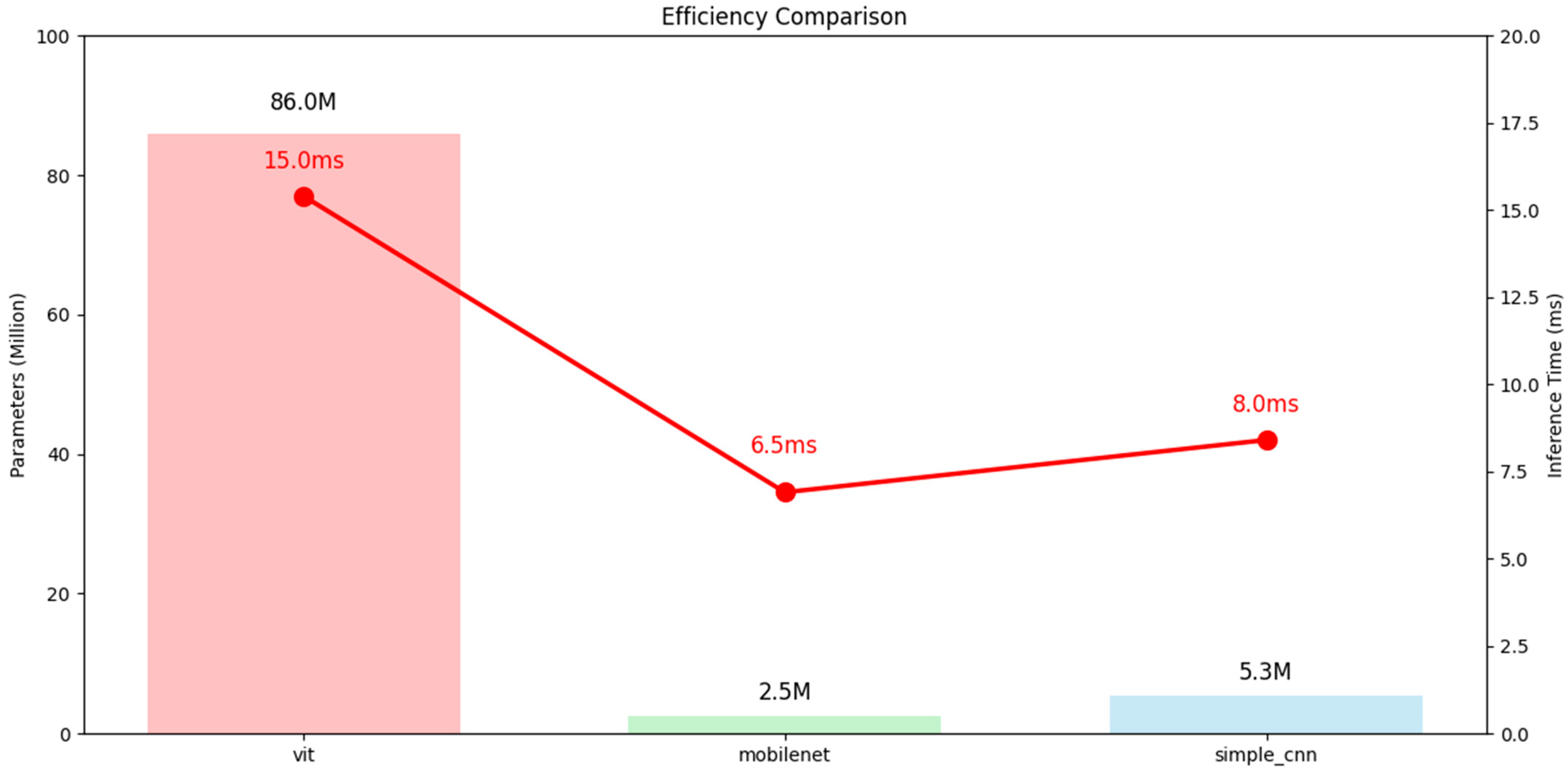The performance of the three models—ViT, MobileNetV3, and SimpleCNN—was evaluated using accuracy, precision, recall, and F1-score, as well as computational indicators such as parameter size and inference time.