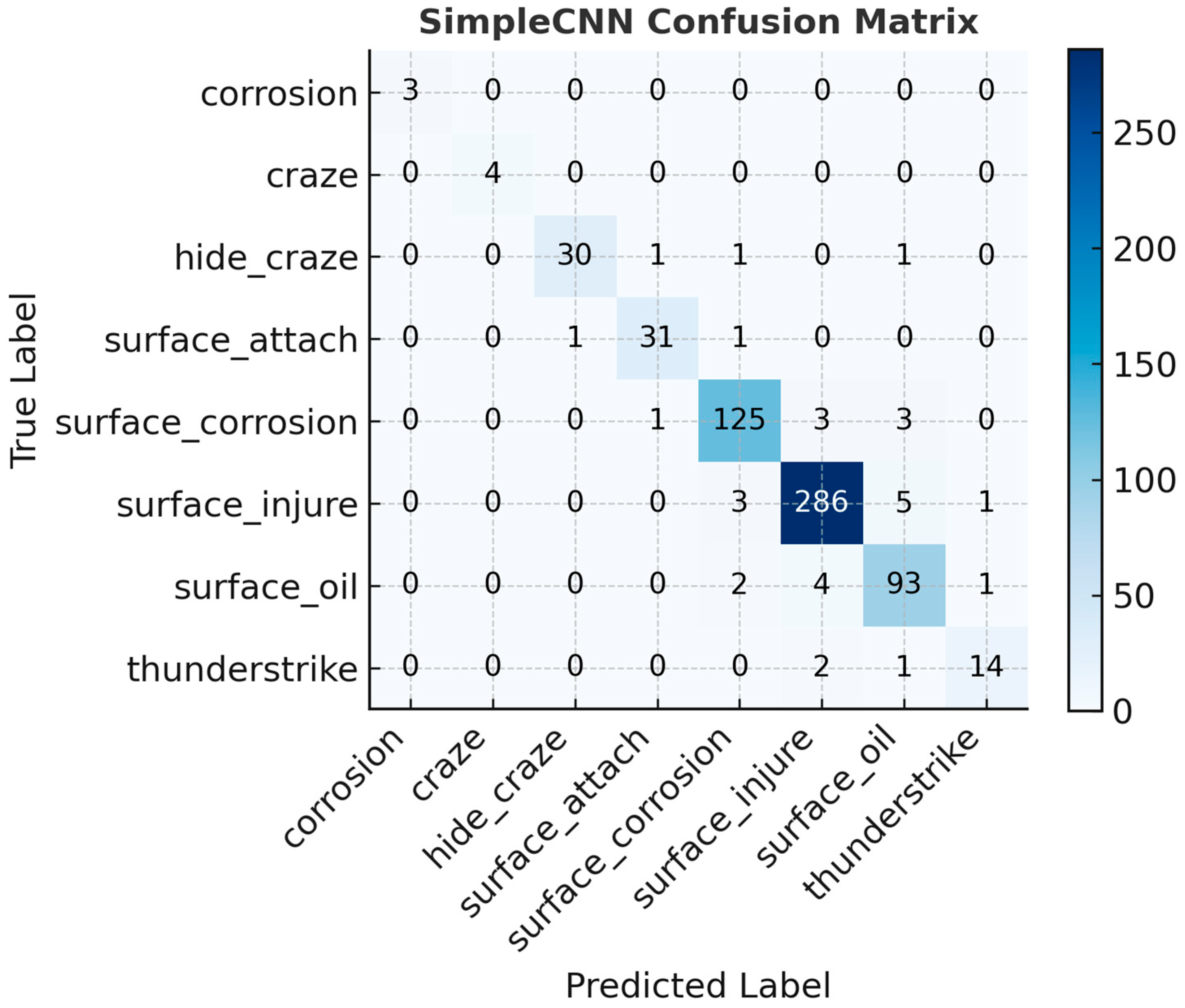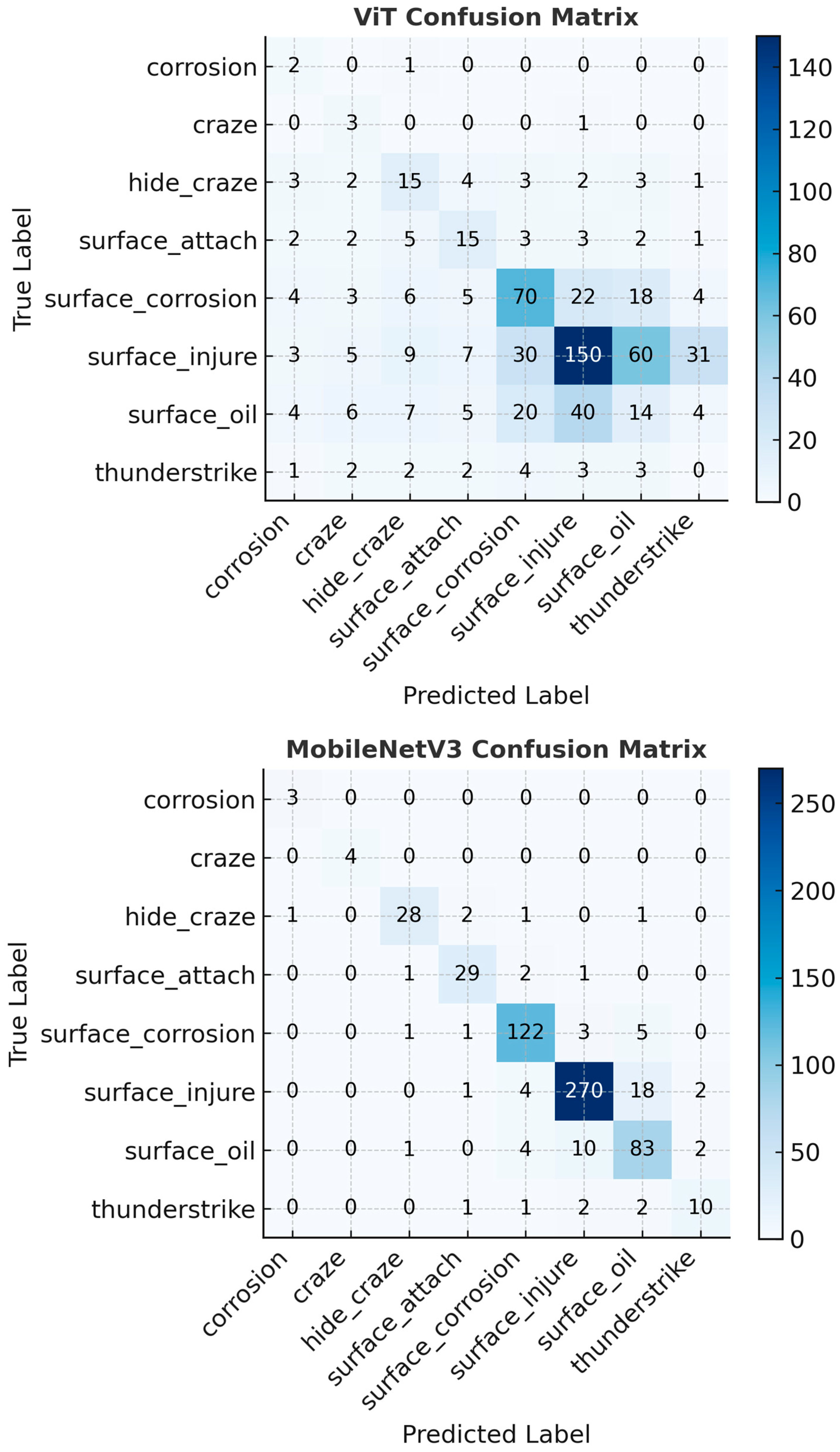 Figure 8) provide additional insights. SimpleCNN’s matrix was nearly perfectly diagonal, confirming its reliable classification across all eight defect categories. MobileNetV3 produced mostly correct predictions but occasionally confused visually similar classes, such as Craze and Hide_Craze. ViT, in contrast, exhibited widespread misclassification, particularly between Surface_Attach and Surface_Oil as well as between Craze and Hide_Craze. These misclassifications are critical in real-world contexts, as overlooking or misidentifying defects can compromise turbine reliability and maintenance planning.