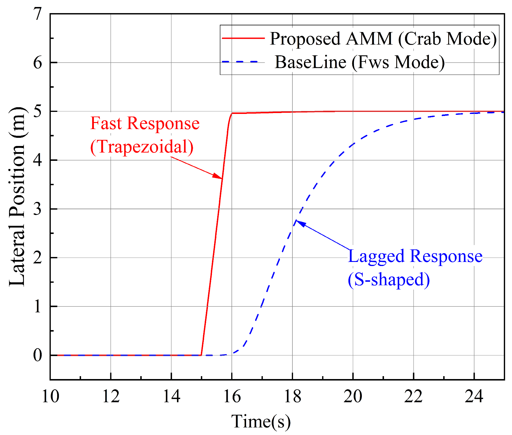 - Overcoming kinematic constraints to enhance maneuver efficiency: The developed AMM framework enables seamless transitions between front-wheel steering, four-wheel counter-steering (4WCS), and crab-walk modes. Simulation results demonstrate that during pure lateral translation tasks, the crab-walk mode effectively avoids path redundancy caused by heading angle adjustments. Compared to traditional front-wheel steering systems, response time is reduced by approximately 75%, enabling smooth maneuvers without overshoot.