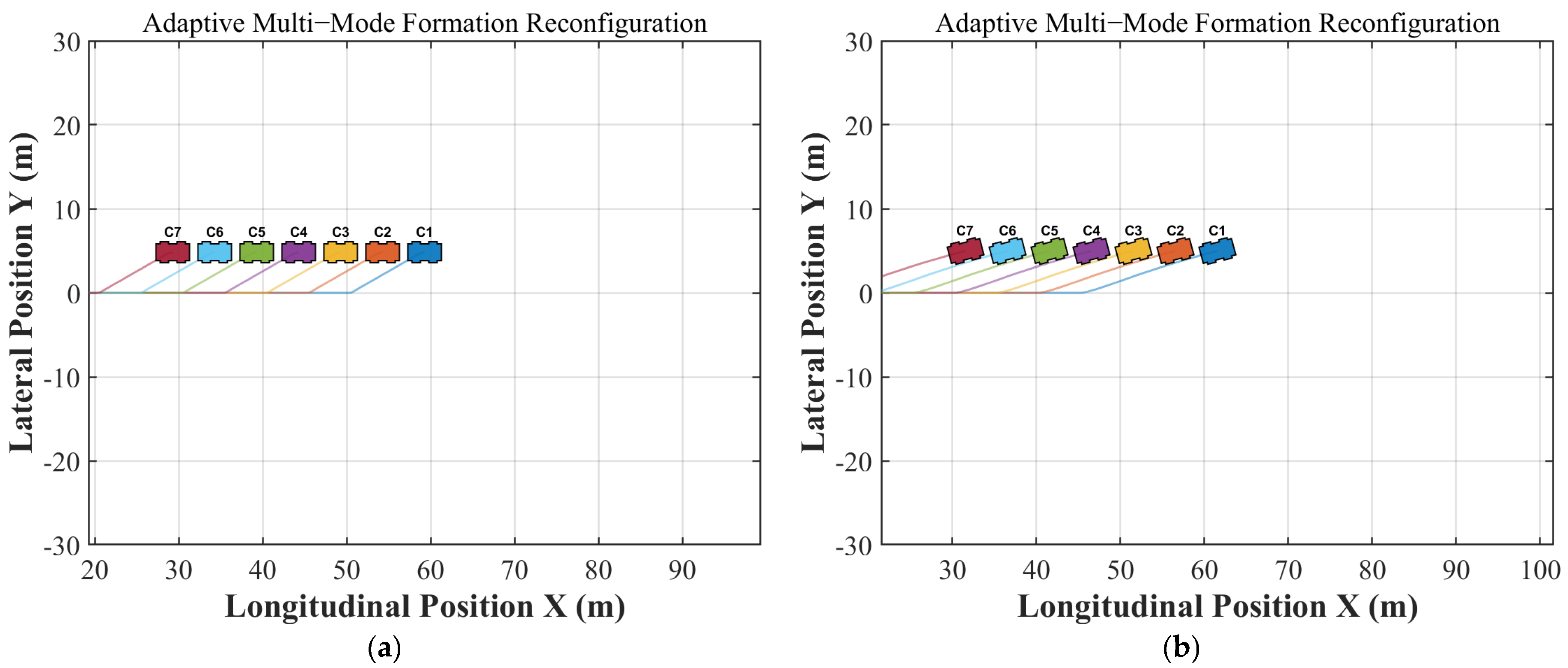 - Outer Vehicles (e.g., C6, C7): Due to the substantial lateral displacement (>10 m) and the need for significant longitudinal acceleration to catch up with the formation, the controller classifies this as a “high-dynamic maneuver.” The system forcibly locks these vehicles into Front-Wheel Steering (FWS) Mode. This decision leverages the high-speed stability of FWS, preventing the potential body oscillations and tire saturation that can occur when attempting large-angle crab maneuvers at high speeds.