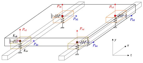 where Ph1, i, Ph2, i, Ph3, I, and Ph4, i are the reverse elastic force in the horizonal direction generated by the installation of the slider on the guideway. Pv1, i, Pv2, i, Pv3, I, and Pv4, i are the reverse elastic force in the vertical direction generated by the installation of the slider on the guideway. Fz and Fy are the forces applied by the worktable in the vertical and horizonal directions. The moments acting on the worktable in the X-direction, Y-direction, and z Z-direction are represented by Mx, My, and Mz, respectively.