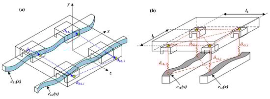The error relationship between the guideway and the slider is shown in Figure 2 and Figure 3. By combining the deformation coordination equation and the static equilibrium equation, the precision error of the linear feed system can be solved, as shown in Equation (3).