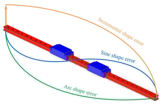The formulas for positive and negative arch-shaped errors of the guideway are as follows (Equations (4) and (5)).