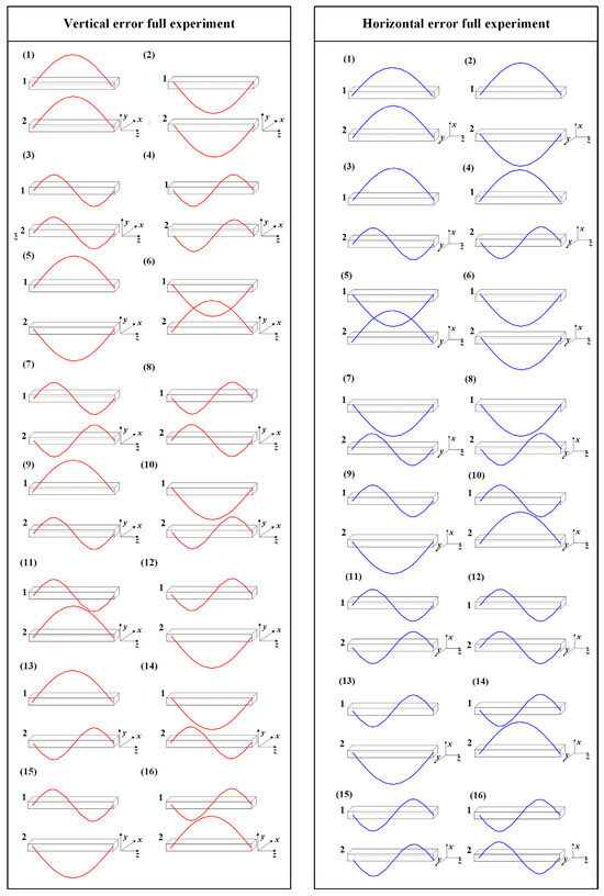 The linear feed system described in this paper includes two guideways, each of which contains two types of errors: arch-shaped errors and sine-shaped errors. To analyze the impact of the guideway geometric error shapes on the accuracy of the linear feed system, the full experiment is designed with two guideways as the factor and four error types as the levels [23], as shown in Table 2 and Table 3 and Figure 5. In Figure 5, the red curve represents errors applied in the vertical direction, while the blue curve represents errors applied in the horizontal direction.