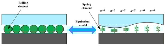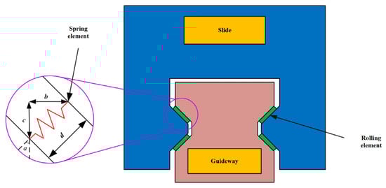 In the finite element simulation of linear rolling guideway pairs, the equivalent method for the contact stiffness of rolling elements is the most important. To simulate various guideway geometric errors, rolling elements are modeled as spring elements. Compression and extension of these springs modify the guideway contact surface geometry, thereby generating different geometric error types, as shown in Figure 6.