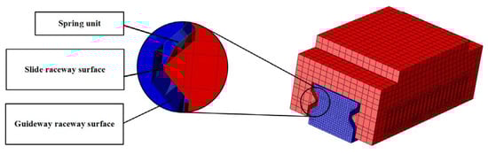 Guideway geometric error shape demonstrates complex, coupled, and variable characteristics, requiring simultaneous consideration of multiple error parameters. Consequently, error-coupling effects are examined by varying the straightness error magnitudes and phases on both guideways. Finite element models of all constituent components are established in the simulation software ABAQUS 6.14, followed by meshing procedures. During finite element simulation analysis, rolling elements at the guideway–slider contact surfaces are simplified into nonlinear line connection elements, as shown in Figure 7 and Figure 8.
