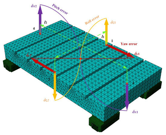 Finite element analysis characterizes worktable pose errors at various guideway positions during motion through static simulation of dynamic conditions, enabling investigation of guideway geometric error-shape impacts on linear feed system precision, as shown in Figure 9.