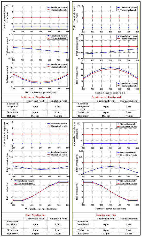 From Figure 10, it can be seen that under identical arch-shaped geometric error with opposing directions on Y-direction guideways, both straightness and pitch errors of the machine tool worktable are minimized, while significant roll error occurs with measured values of 42.76 μm/m and 42.78 μm/m, respectively. Under identical sine-shaped guideways with opposing direction in the Y-direction, both straightness and pitch errors approach zero, while roll error remains below arch-profile levels at measured values of 7.983 μm/m and 7.897 μm/m.