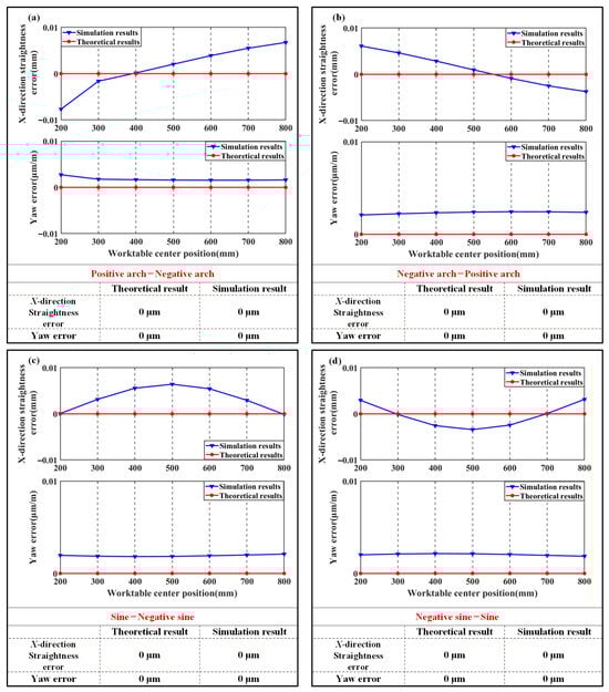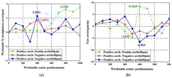 To verify that machining linear feed system tolerance requirements can be relaxed through guideway shape design, the worktable X-straightness error and yaw error under positive arch–positive arch horizontal error and positive arch–negative arch horizontal error are compared, as shown in Figure 25.