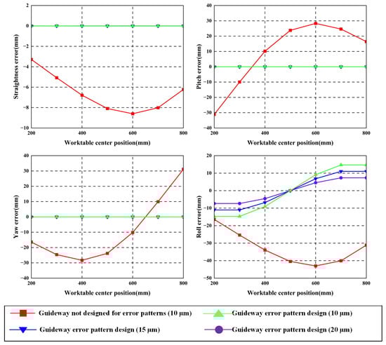 It can be seen from Figure 25 that after guideway error design is implemented in the horizontal direction, the worktable straightness error and yaw error are both smaller than those without guideway error design, compared to the worktable pose error without guideway error design. After the amplitude of the geometric errors of the guideways following guideway error design is enlarged, a similar level of accuracy to the linear feed system without guideway error design can still be maintained. This demonstrates the effectiveness of performing guideway error-shape design and analysis and verifies the correctness of the theoretical and finite element results.