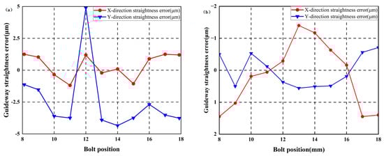 By using the 40 μm feeler gauge, the horizontal errors of the two guideways are modified into a positive arch–negative arch error shape. The geometric errors of the guideways are measured using the same method as in Step 1, as shown in Figure 21 and Figure 22.