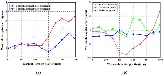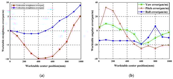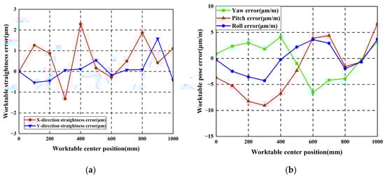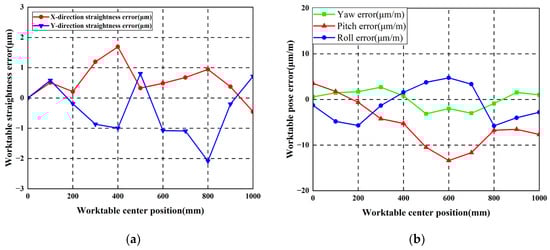 Vertical guideway errors impact worktable pitch error, roll error, and vertical straightness error. Horizontal guideway errors affect worktable yaw error and horizontal straightness error. According to the error-coupling test results in Table 2 and Table 3, combined with Equation (3), the X-direction straightness error, the Y-direction straightness error, the yaw error, the pitch error, and the roll error are calculated. The results are shown in Table 4.