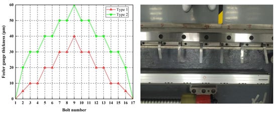 To modify the geometric error shapes of the guideway, feeler gauges are inserted at midpoints between adjacent screws uniformly distributed between the guideway base surface and the guideway. Different geometric error shapes of the guideway are simulated by varying feeler gauge specifications, with gauge dimensions and shimming configurations shown in Figure 18.