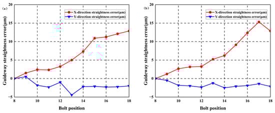 Straightness error of guideways with 40 μm reverse arched errors: (a) left guideway; (b) right guideway.