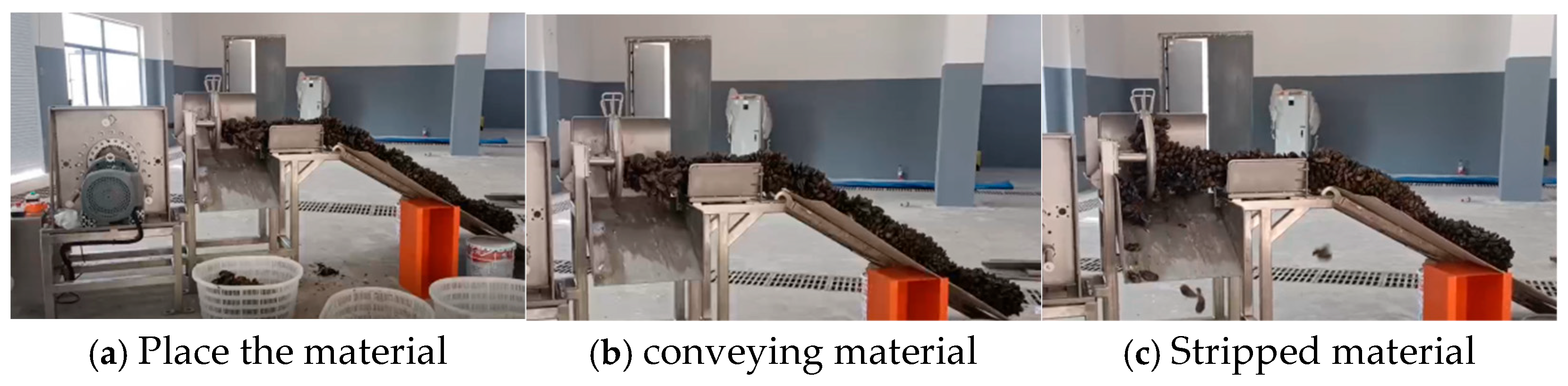 - Cheng, H.; Yuan, Y.; Xie, F.; Li, D. Design of Screw-Driving Mussel Breeding Rope Removal Equipment. Light Ind. Mach. 2021, 39, 23–28+34. [Google Scholar]