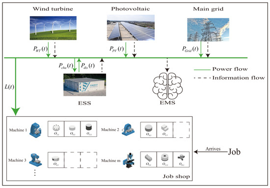 As shown in Figure 1, the LEDFJSP-RE model consists of photovoltaic (PV), wind turbines (WT), an energy storage system (ESS), an energy management system (EMS), and a job shop. The job shop system, serving as the load unit of the LEDFJSP-RE model, is composed of m heterogeneous machines that execute processing tasks of arriving jobs. Each job consists of multiple operations, and each operation can be processed on any of the m machines, with varying processing times and energy consumption across different machines.