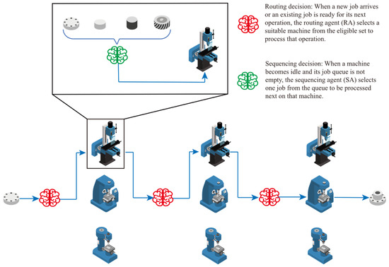 Under this energy structure, different scheduling decisions can significantly affect both the production performance and the energy-related outcomes of the job shop. Therefore, the scheduling system must optimize traditional objectives while simultaneously pursuing low-carbon operation under fluctuating renewable energy supply. To this end, an energy-aware scheduling strategy driven by two cooperative intelligent agents is designed. As shown in Figure 2, the routing agent (RA) determines the assignment of operations to machines, while the sequencing agent (SA) selects the next job to be processed from the waiting queue when a machine becomes idle. At each decision epoch triggered by dynamic events such as job arrivals or machine idle states, the agents observe both production states and energy-related information and generate corresponding scheduling actions. Through this hierarchical decision structure, job routing and sequencing decisions are jointly optimized, enabling the system to dynamically adapt to variations in job arrivals and renewable energy supply while balancing scheduling efficiency and carbon emission control. In this way, the LEDFJSP-RE is formulated as a sequential decision-making problem under coupled production and energy dynamics. To simplify the modeling complexity and focus on the scheduling and energy-aware decision-making mechanisms, a set of commonly adopted assumptions is introduced in this study, following related research on flexible job shop scheduling and energy-aware production scheduling. It should be noted that these assumptions mainly correspond to operational constraints that are frequently encountered in practical manufacturing systems but are not central to the decision logic investigated in this work. Neglecting these constraints allows clearer analysis and comparison of scheduling strategies without affecting the core scheduling mechanisms: