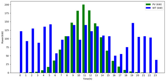 Equations (8)–(17) represent the constraints of this study. Equation (8) indicates that each operation can only be assigned to one machine. if , it means that is unassigned at time . Equation (9) enforces the machine capacity constraint, indicating that two different operations assigned to the same machine cannot be processed simultaneously, and their processing intervals must not overlap. Equation (10) represents the technological precedence constraint, which ensures that the operations of each job are executed sequentially in the predefined order. Equation (11) defines the completion time of each operation as the sum of its start time and the processing time on the selected machine, thereby reflecting the non-preemptive processing assumption. Equation (12) ensures that the power consumption of each machine does not fall below its idle power , reflecting the baseline energy consumption of machines even when they are not actively processing. Equation (13) defines the power balance within the job shop. The total load demand at time must be met by the sum of renewable generation from PV and WT units, the discharging power of ESS, and supplementary power purchased from the main grid, minus the charging power of ESS. Equation (14) describes the state update of ESS. The energy stored in ESS at time , denoted by , depends on the previous energy level, the effective charging power, and the effective discharging power. Equations (15) and (16) sets the feasible ranges of charging and discharging power. Equation (17) imposes the operational constraint that ESS cannot charge and discharge simultaneously. The binary variables and are introduced to indicate the charging and discharging states, ensuring mutual exclusivity.
