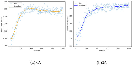 The training results are shown in Figure 6. As training episodes increase, the cumulative rewards of both RA and SA show an overall upward trend, indicating that the agents have successfully learned effective policies.