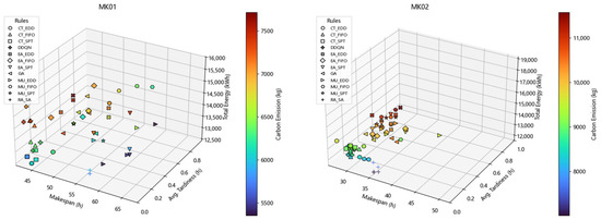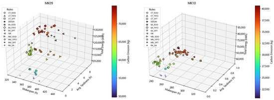 Figure 10 presents a comparative illustration of the production load and renewable energy supply curves obtained by the three scheduling rules under the same renewable energy scenario. It can be observed that the ME routing rule consistently favors low-energy-consumption machines during machine selection, while neither explicitly accounting for the temporal fluctuations of renewable energy supply nor imposing constraints on job completion time and tardiness risk. As a result, jobs tend to be concentrated on a small number of low-energy machines, leading to load congestion in the time dimension and a significant extension of the makespan. Meanwhile, traditional rules such as EA_FIFO and CT_SPT, which lack a joint consideration of energy states and overall system load, struggle to achieve a balanced trade-off among makespan, energy consumption, carbon emissions, and job tardiness. In contrast, RA_SA not only accounts for machine-level energy consumption differences but also incorporates explicit awareness of renewable energy generation states. Through cooperative multi-agent decision-making, RA_SA dynamically adjusts job assignments and processing sequences, enabling the production load to better align with the renewable energy supply curve over time. This allows RA_SA to effectively reduce energy consumption and carbon emissions while simultaneously restraining the growth of makespan and job tardiness.
