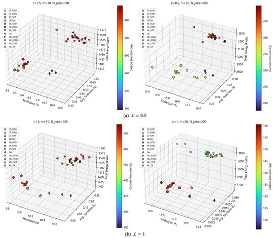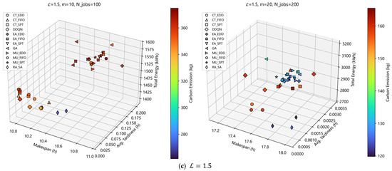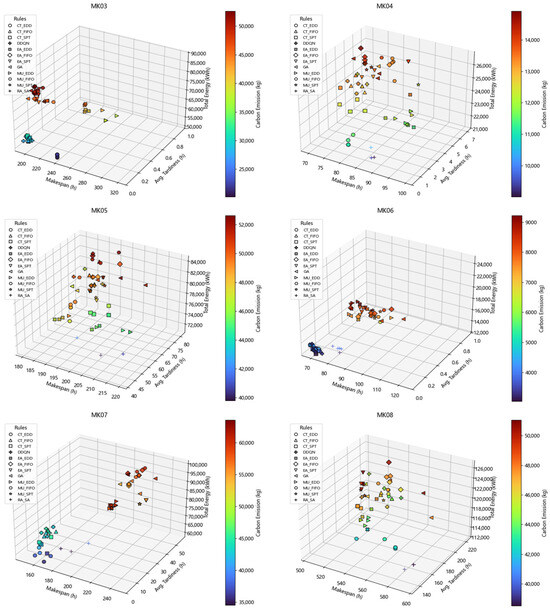 Furthermore, the Pareto fronts obtained by RA_SA and other competing algorithms for several representative instances are illustrated in Figure 9. It can be observed that RA_SA is able to generate solution sets that are closer to the ideal Pareto front and exhibit a more balanced distribution among different objectives, highlighting its comprehensive advantages in terms of convergence and diversity. These results indicate that RA_SA can effectively coordinate conflicting objectives such as makespan, energy consumption, and carbon emissions in dynamic environments.