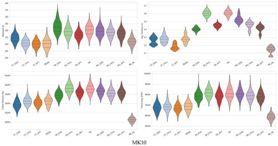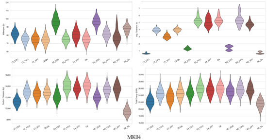 Further analysis indicates that although the single-agent DDQN method exhibits a certain degree of convergence in some instances, it still suffers from notable limitations in terms of solution diversity and stability. This limitation mainly arises from its single-agent decision-making structure, in which job assignment and sequencing decisions are coupled within a unified policy, thereby lacking sufficient flexibility and coordination when handling conflicting multiple objectives. Figure 8 presents violin plots of the four optimization objectives for the MK04 and MK10 instances, from which it can be observed that the solution sets obtained by RA_SA are clearly superior to those of the other comparative methods in terms of both distribution uniformity and numerical performance.