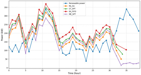 A test instance with a scale of 1.5 × 20 × 200 () is selected to evaluate the scheduling performance of RA_SA in terms of carbon emission control and operational cost under scenarios involving renewable energy participation. In addition to RA_SA, three comparative scheduling strategies are considered in the case study, including the EA_FIFO, the CT_SPT rule that ranked second overall in the previous experiments, and an energy-oriented scheduling method that combines a minimum energy routing rule (denoted as ME) with the SPT sequencing rule. Specifically, the ME routing rule prioritizes the assignment of each operation to the machine with the lowest processing energy consumption at the machine-selection stage.