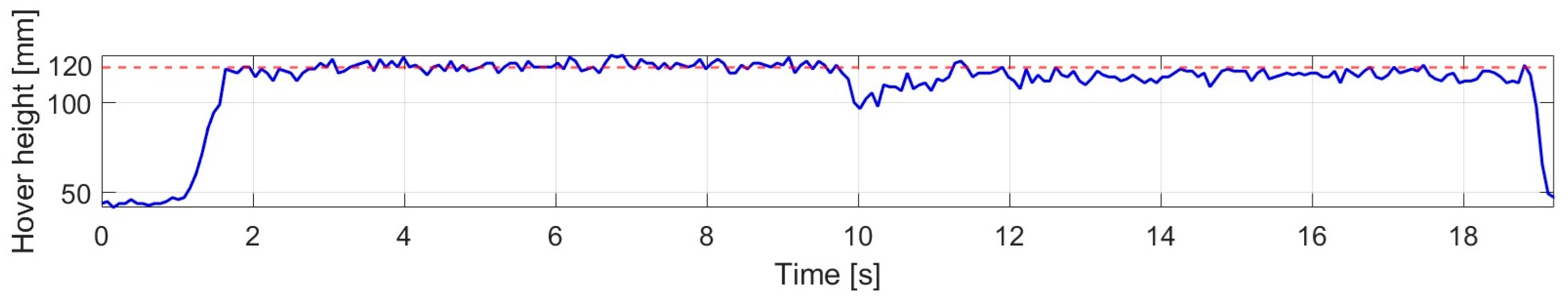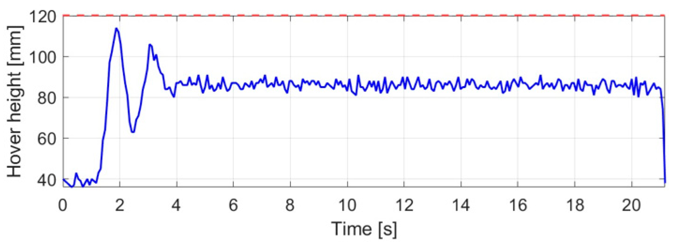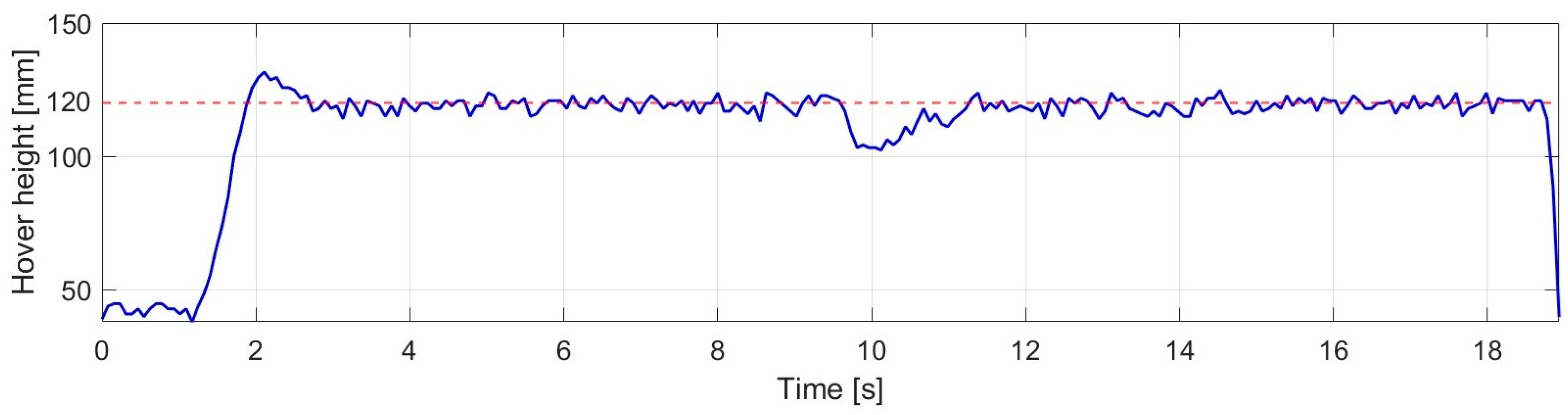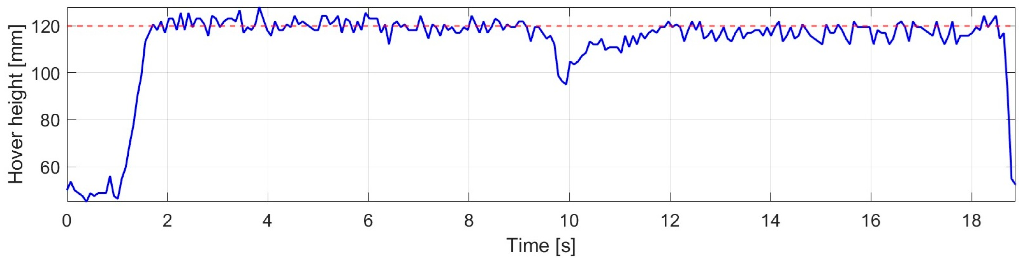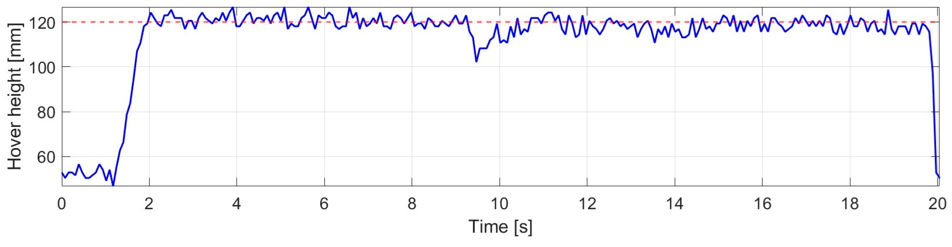 During the hovering phase, the average altitude was 118.102 mm, showing a minimal and well-damped deviation from the 120 mm reference value. The control response remained consistently stable, without significant oscillations or periodic fluctuations.