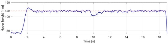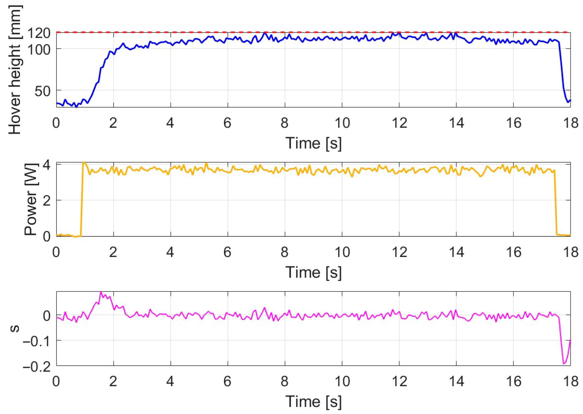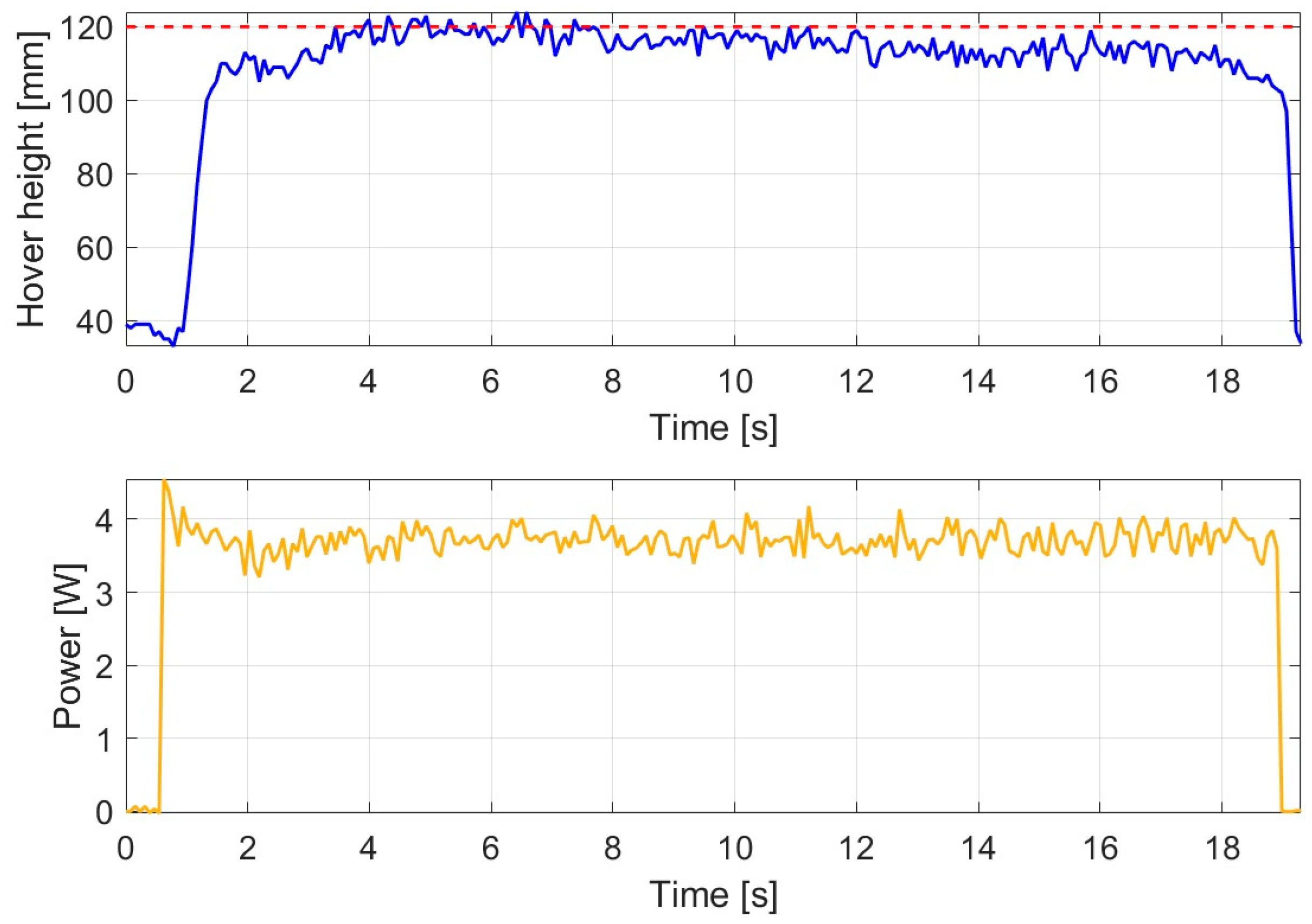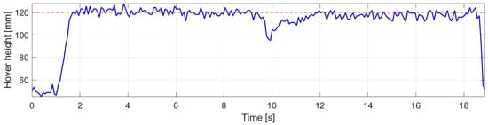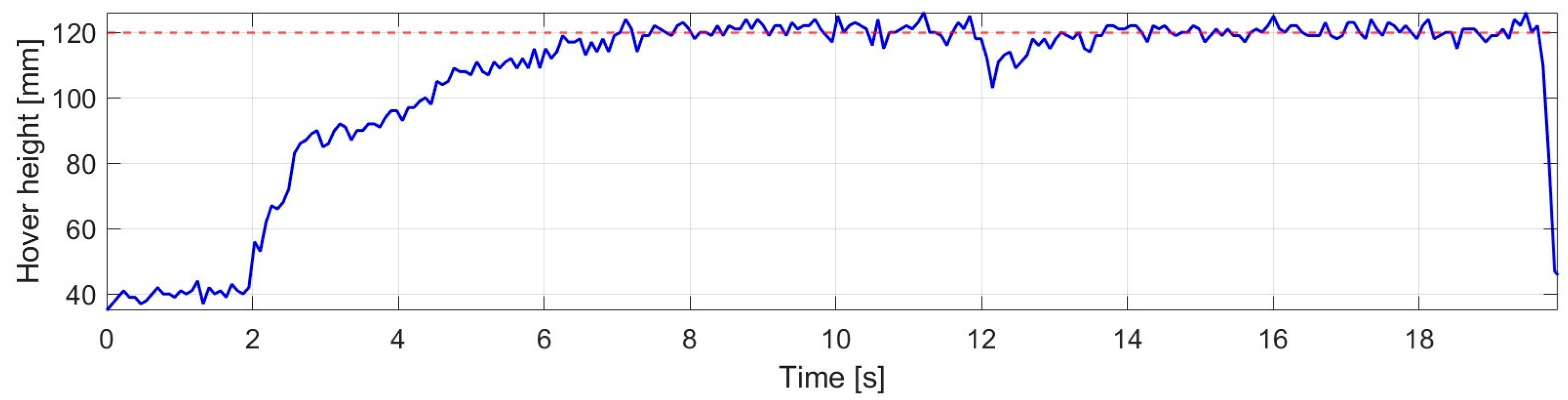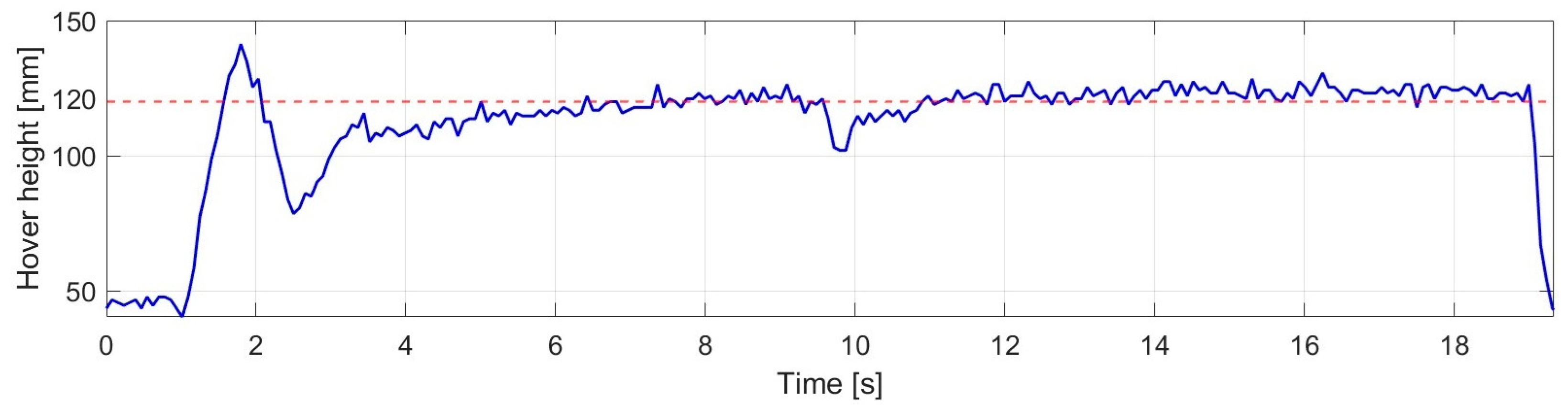 During the hovering phase, the average altitude was 118.102 mm, showing a minimal and well-damped deviation from the 120 mm reference value. The control response remained consistently stable, without significant oscillations or periodic fluctuations.