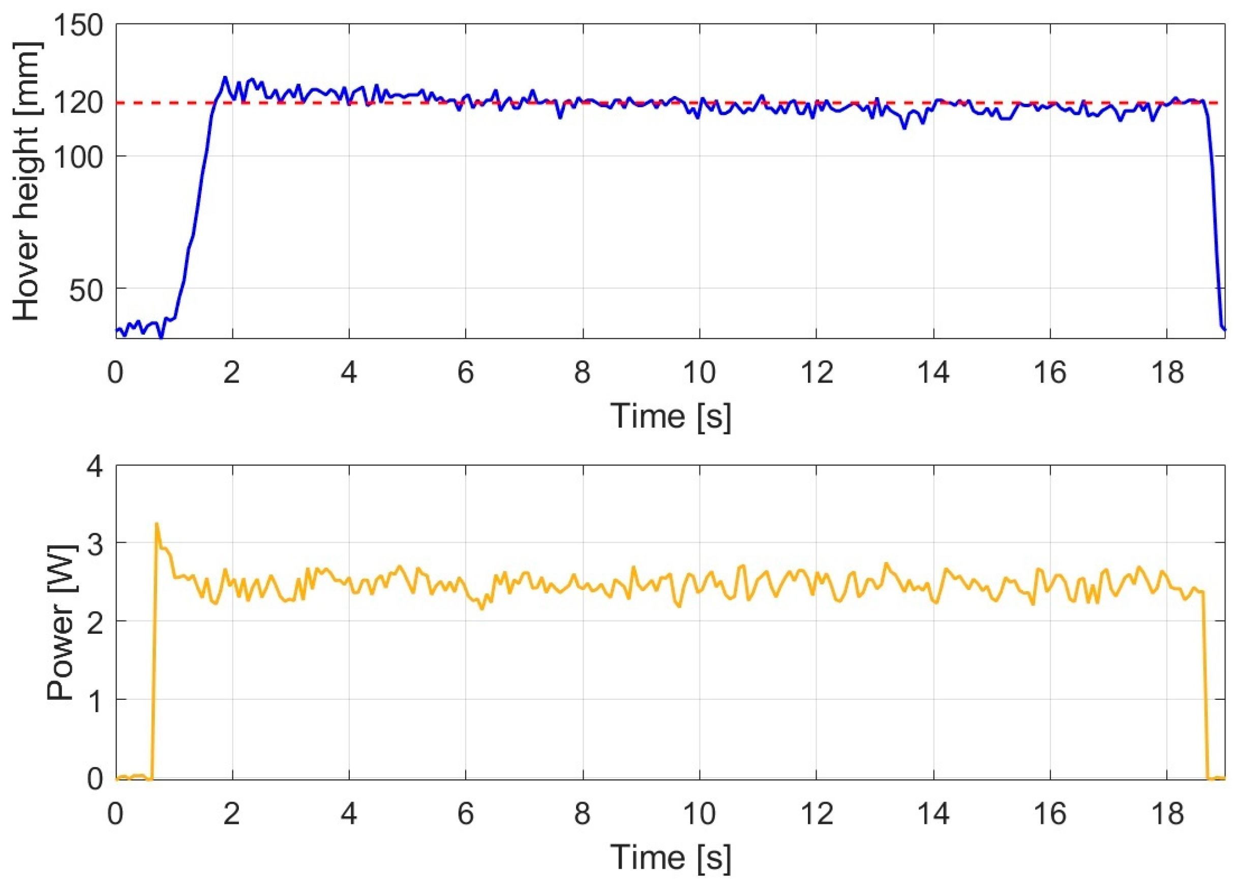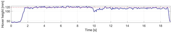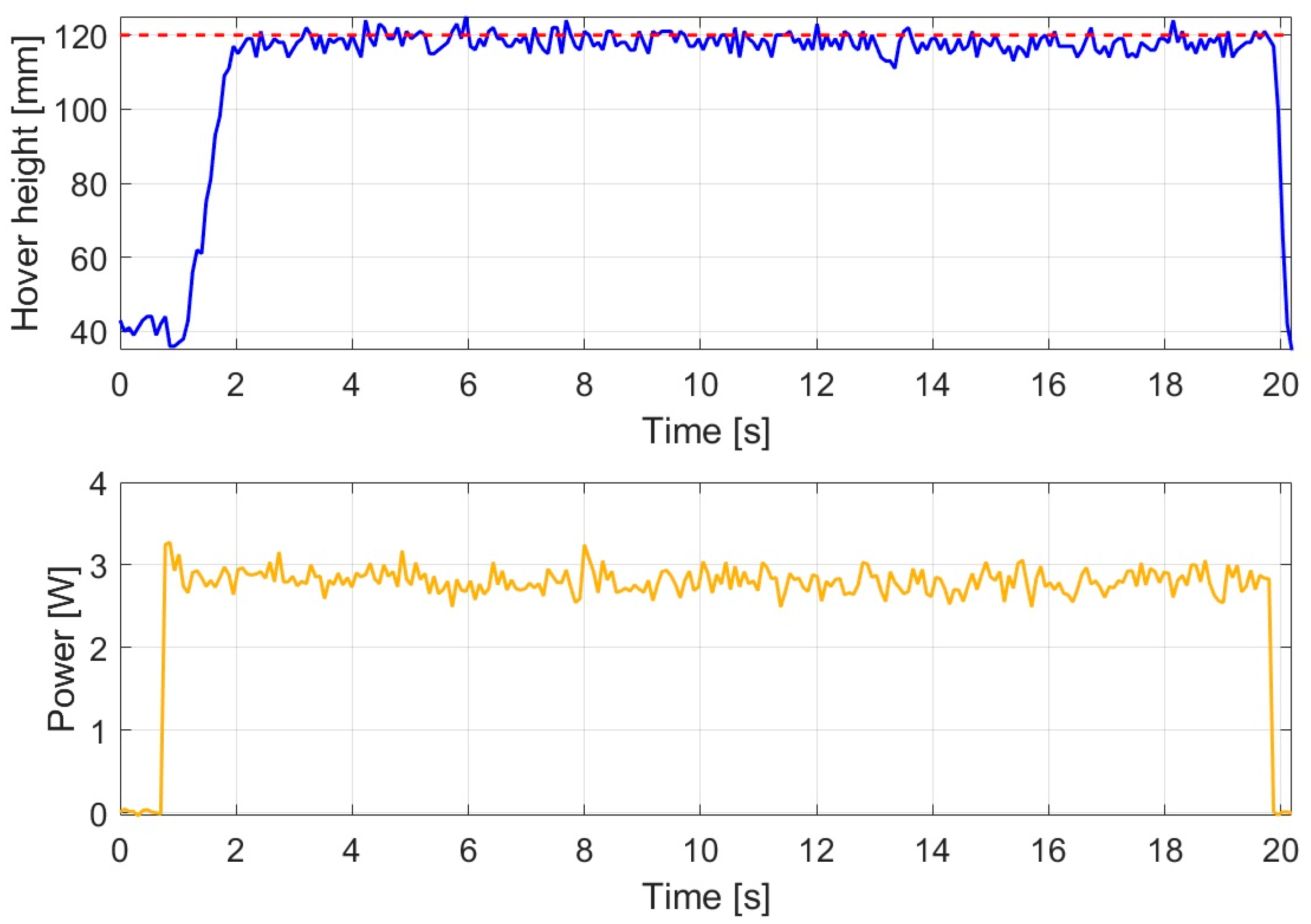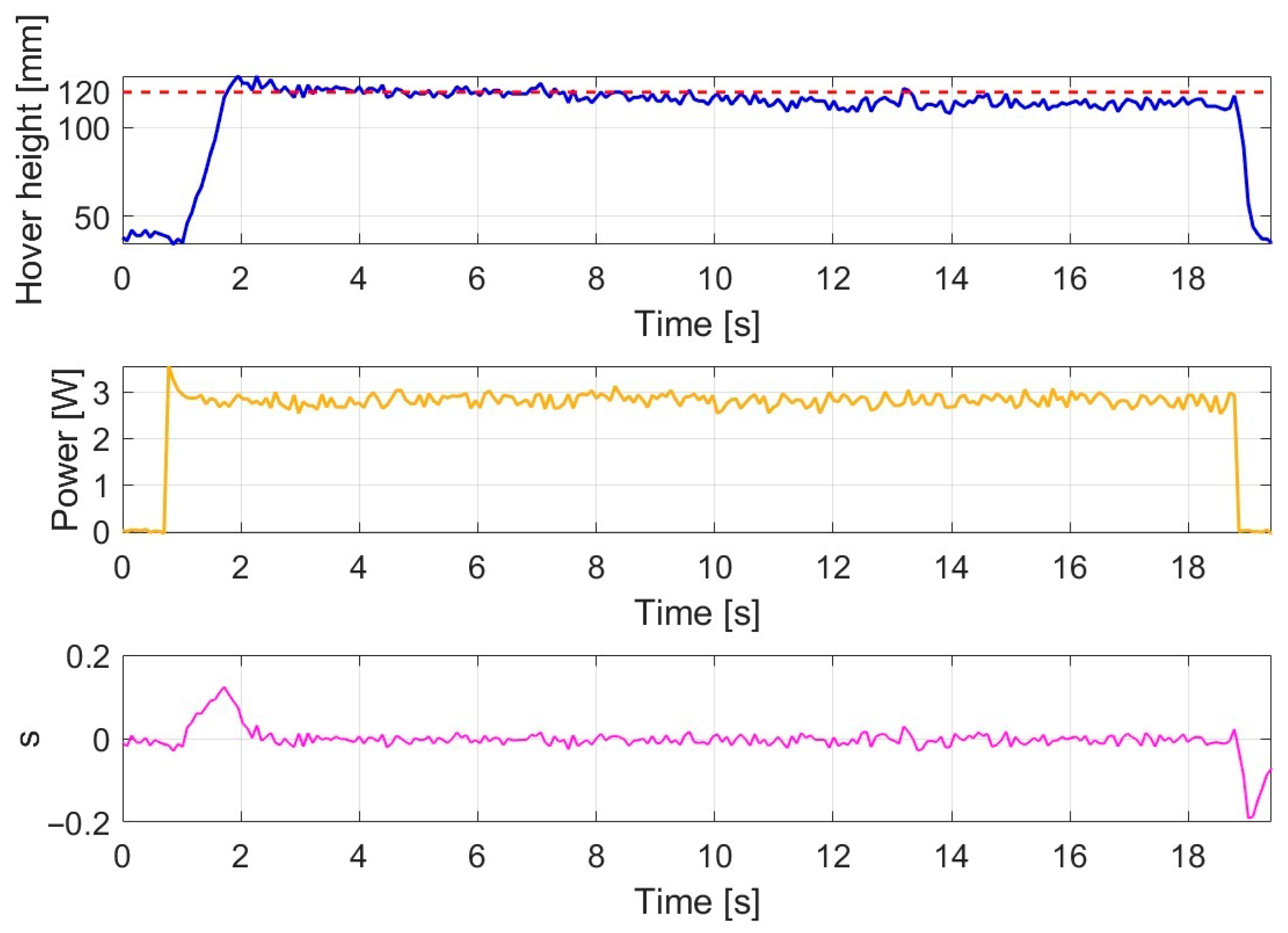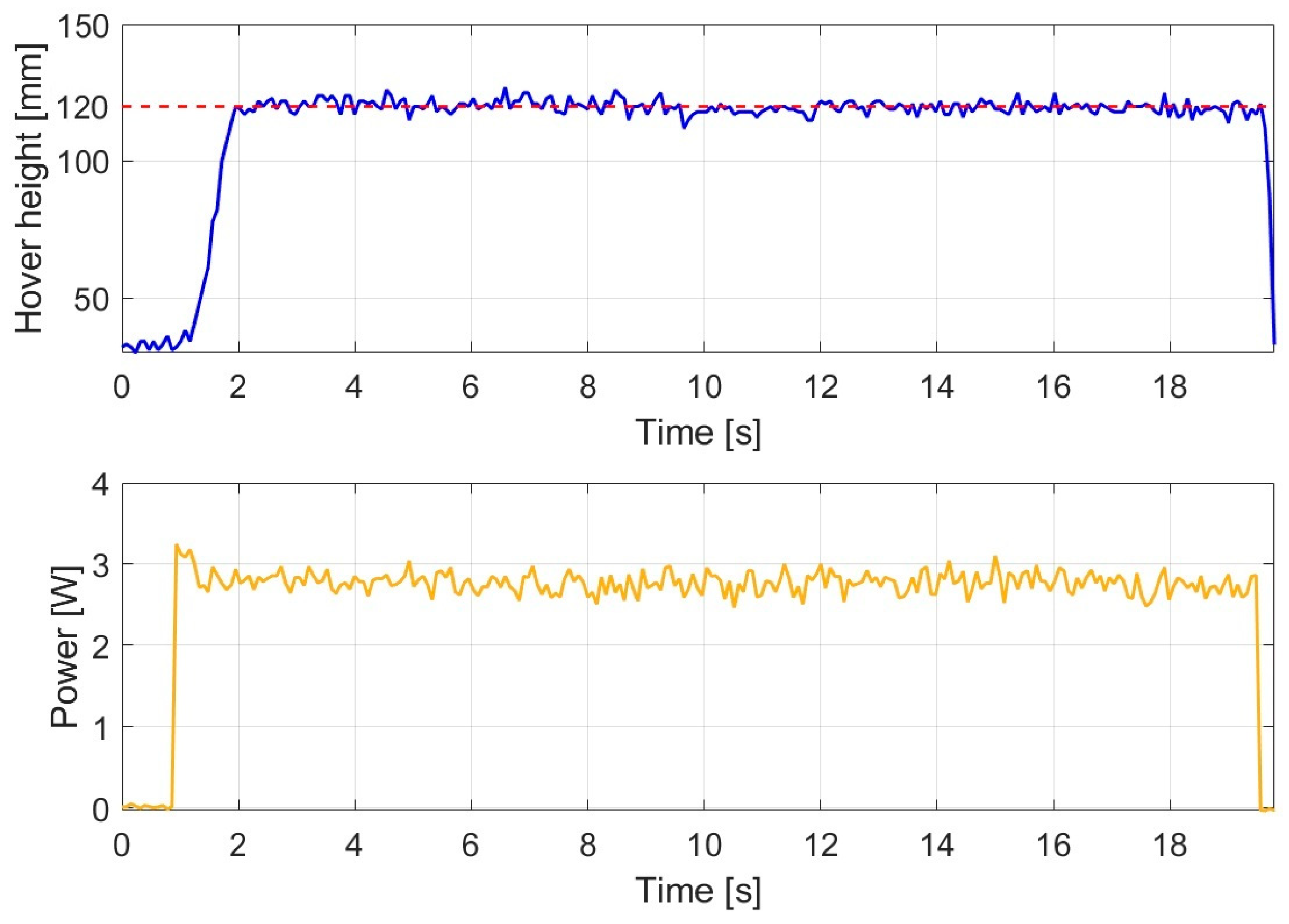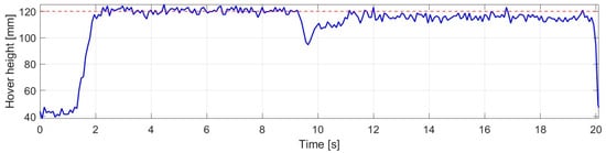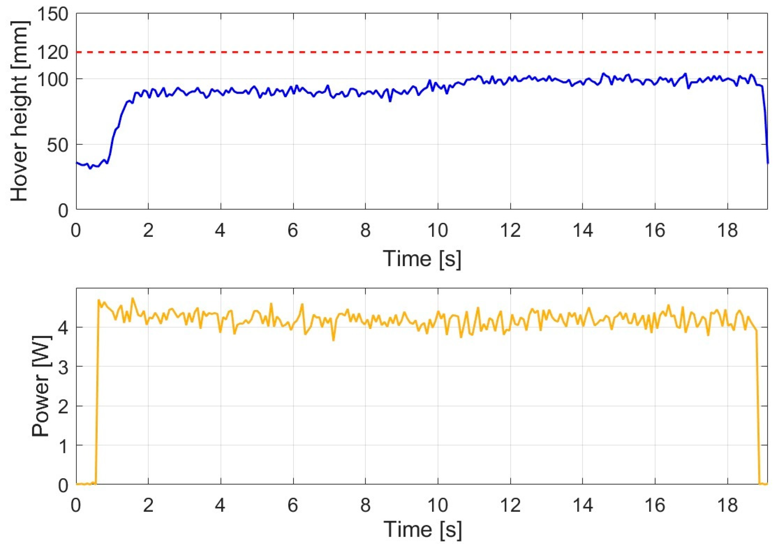 During the hovering phase, the average altitude was 118.102 mm, showing a minimal and well-damped deviation from the 120 mm reference value. The control response remained consistently stable, without significant oscillations or periodic fluctuations.