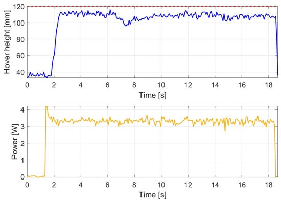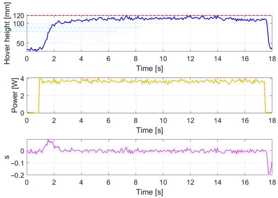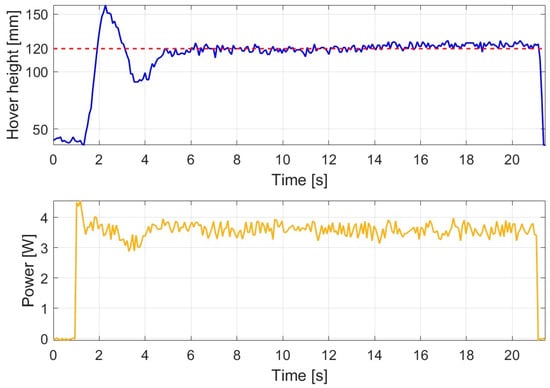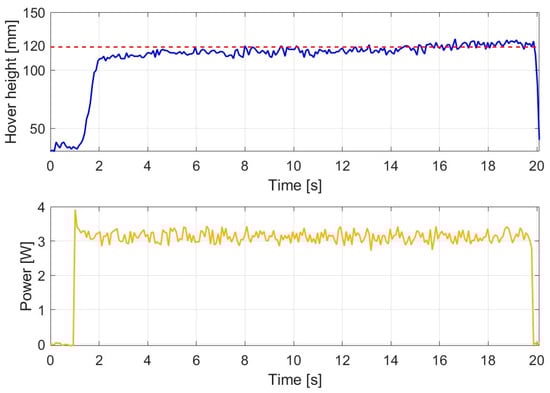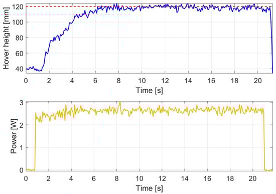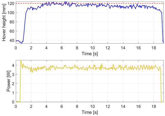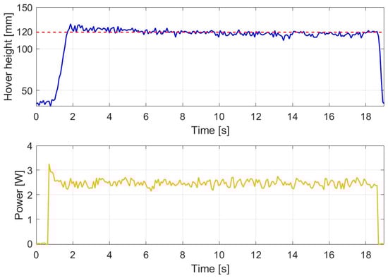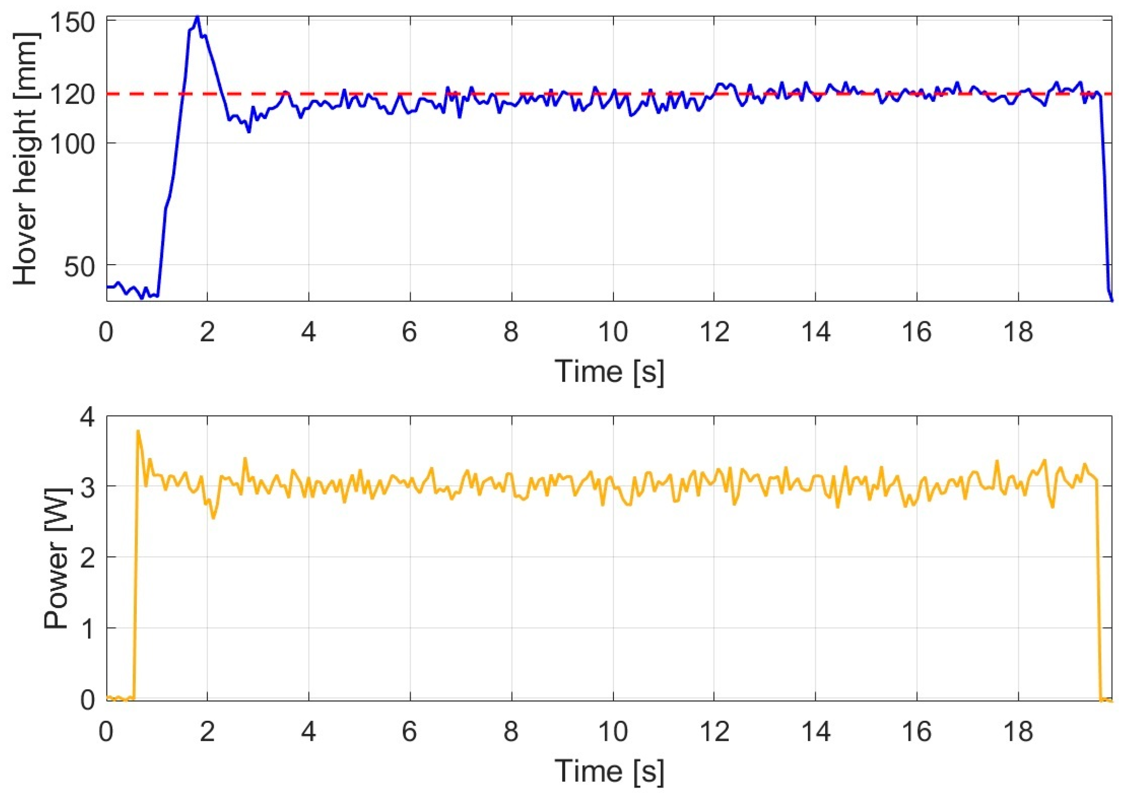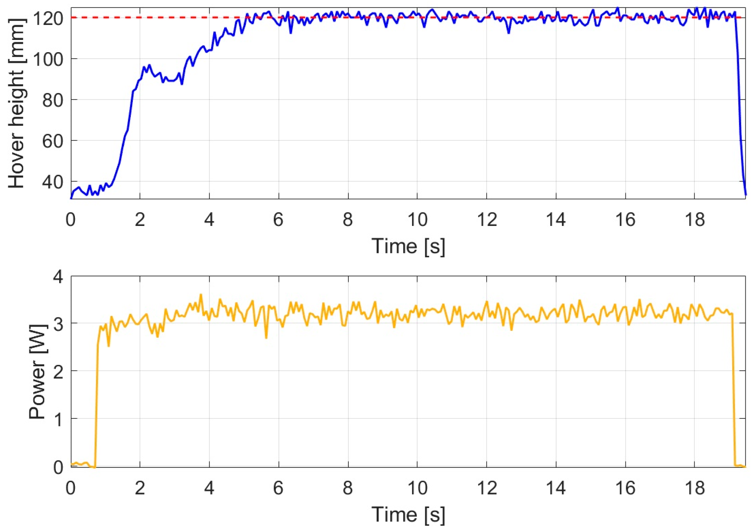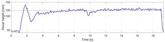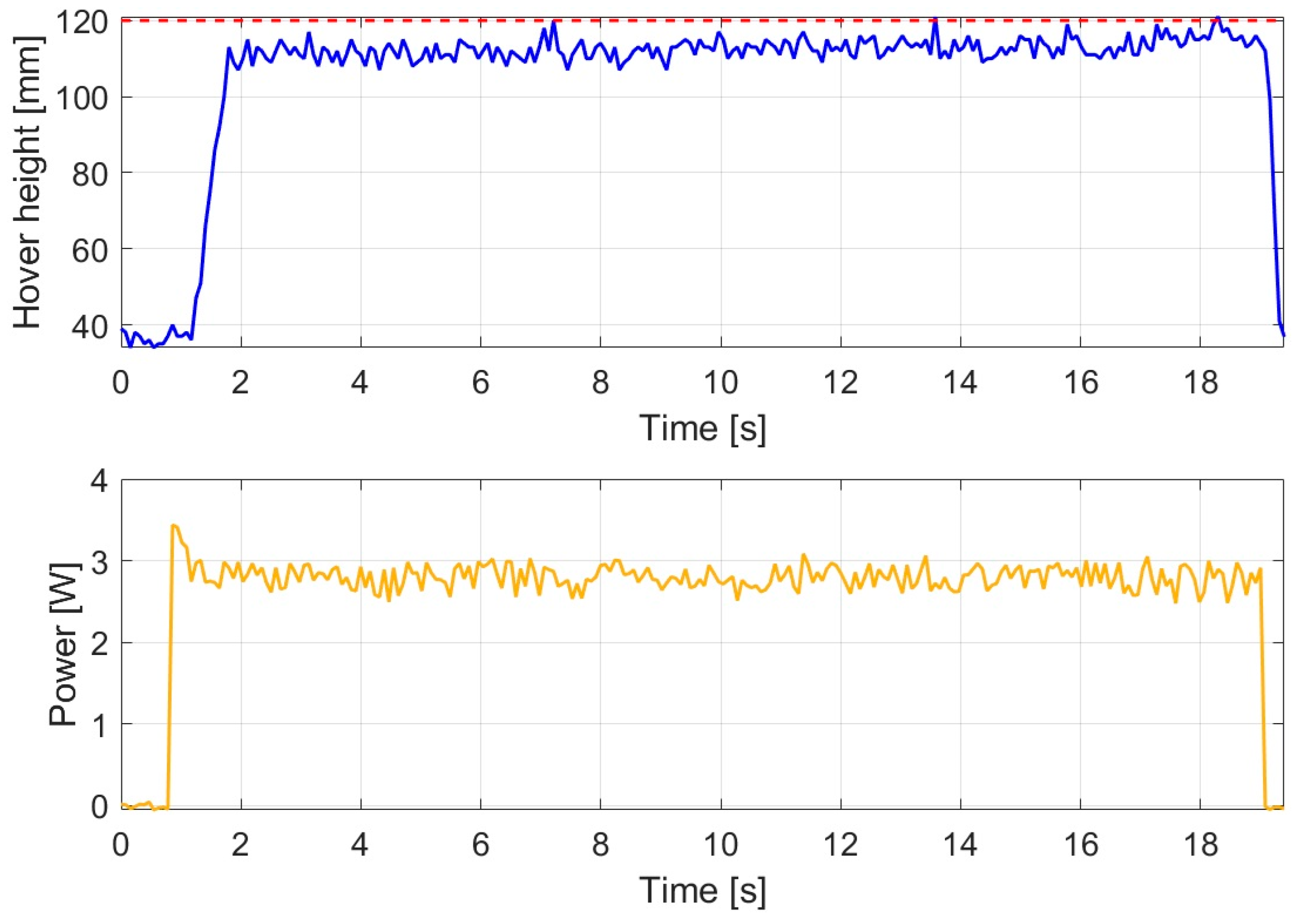 During the hovering phase, the average altitude was 118.102 mm, showing a minimal and well-damped deviation from the 120 mm reference value. The control response remained consistently stable, without significant oscillations or periodic fluctuations.