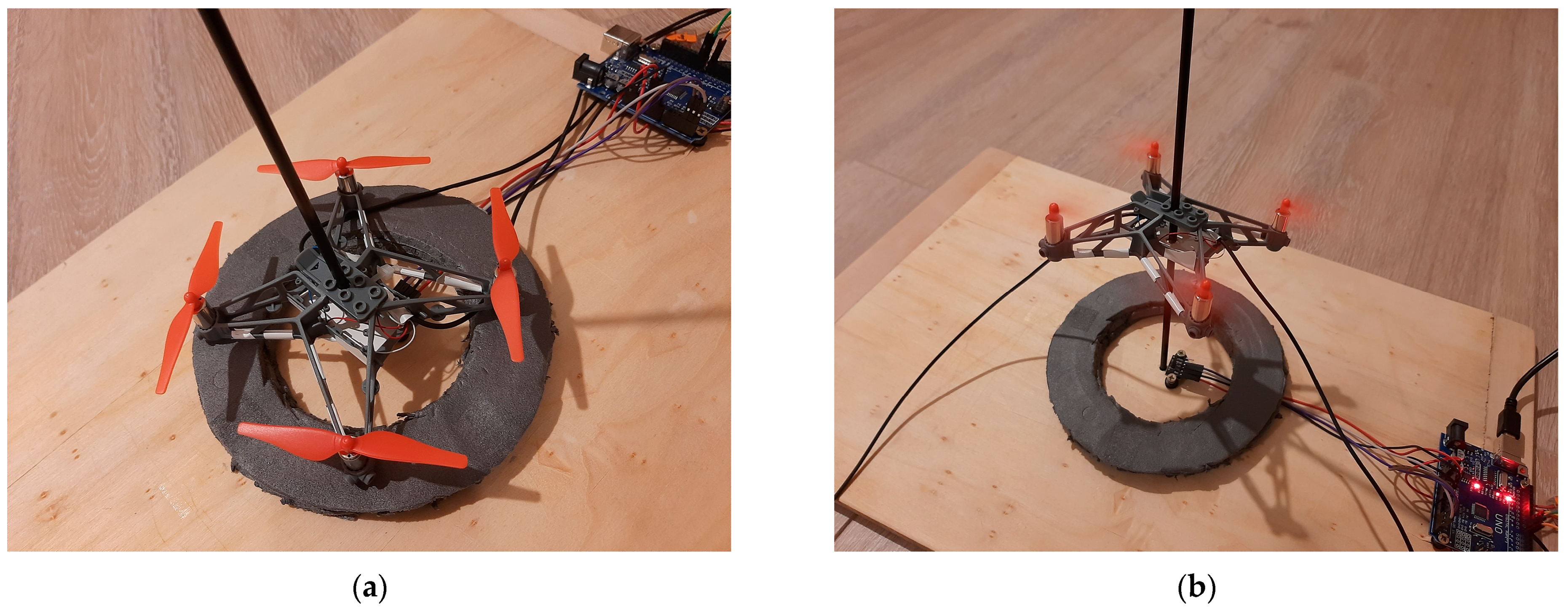 25]. The experimental platform is based on a Parrot mini drone frame (Parrot SA, Paris, France)equipped with Parrot Mambo motors (Parrot SA, Paris, France), an ATmega328P (Arduino UNO, Arduino S.r.l., Via Andrea Appiani 25, Monza, Italy) microcontroller, an ACS712 current sensor (Allegro MicroSystems, Manchester, NH, USA), and a VL53L0X laser distance sensor (STMicroelectronics, Geneva, Switzerland), while the control algorithms are executed in the MATLAB 2023b (MathWorks, Natick, MA, USA) environment and the actuation is performed using pulse-width modulation (PWM).