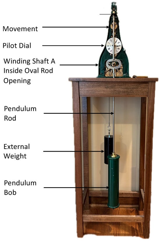 Throughout the period from the 15th to the 20th centuries, mechanical timekeeping devices embodied the progression of scientific knowledge, craftsmanship, and the evolution of artistic creativity [19]. In the late 1800s and beyond, tower and street clocks, serving as prominent visual timekeepers, facilitated the coordination of daily routines within communities, enhancing commerce and transportation. This included factory time recorders for workers, business meeting scheduling, railroad timetables, and personal pocket watches [20]. These pendulum clock mechanisms, studied by Galileo Galilei and pioneered by Christian Huygens, exemplify remarkable engineering feats [21]. The movement harnesses potential energy from a suspended weight or wound spring, channeling it into the periodic oscillations of a pendulum through intricate reduction gears and escapement. Notably, the Graham deadbeat escapement ensures precise regulation by discretizing rotational motion into pendulum swings using dual pallets [22,23]. A thin steel suspension spring maintains pendulum alignment, while the escapement-connected crutch imparts controlled impulses. The time display, extracted from the gear train’s second set of wheels with a 12:1 hour ratio, and the periodic winding of the weight every 8 days using a removable hand crank further characterize these clocks. Fine adjustments to the pendulum length, facilitated by a screw adjustment, regulate the clock’s accuracy. An exemplary model of a classic pendulum movement is the 1905 Seth Thomas Model 04, whose integrated components (shafts, gears, and pendulum) are shown in Figure 3. As anticipated, the availability of electric motors, quartz crystals, and atomic technology relegated traditional mechanical timepieces to a historical role.