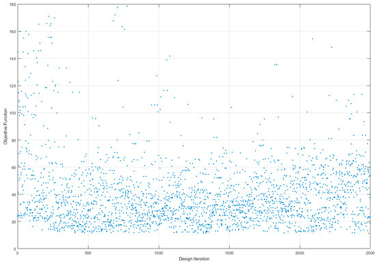The design study results, obtained from this software package using a genetic algorithm optimization strategy, will be evaluated and discussed. The solution history of the objective function against the iteration number of generations is depicted in Figure 7. A total of 2500 iterations were considered, and 950 designs were Pareto solutions. At the optimization algorithm conclusion, the minimum cost function value was = 11.2642, and the four Pareto design variables are = [1.1875, 0.035818, 0.355, 0.004]. Compared to the Seth Thomas clock factory design vector, , the differences in the final design values were = [−0.62%, −2.40%, 8.78%, −52.38%]. Further, the objective function for the factory design variables was = 16.9262. The optimized pendulum system period and quality factor were 2.0013 (sec) and 3995, respectively, which are improvements in the design. The change in the pendulum rod and cylinder dimensions resulted in a total pendulum system mass of = 4.3757 (kg). The thickness of the gear teeth appears to have been overdesigned for the hanging weight, given the dimensional reduction (Note: clock hand load was neglected, and compound pulleys may increase the applied hanging weight load). The maximum bending stress listed in Table 1 ensures mechanical component durability due to cyclic loadings over long periods.
