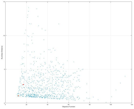 The minimum Euclidean distance value corresponds to the best design variables, .