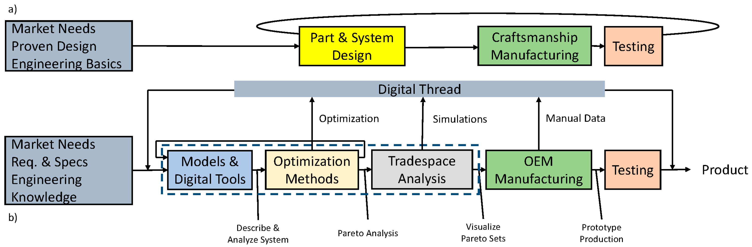 - The digital design thread accelerates the design process and reduces iterative physical prototyping. The shift from prototype build to virtual model-driven decision-making can quicken the design cadence per Figure 2. The validated model, optimization, and tradespace tools significantly reduced iteration cost, demonstrating advantages of a model-driven, data-supported process over designs rooted in accumulated empirical knowledge and craftsmanship over centuries.