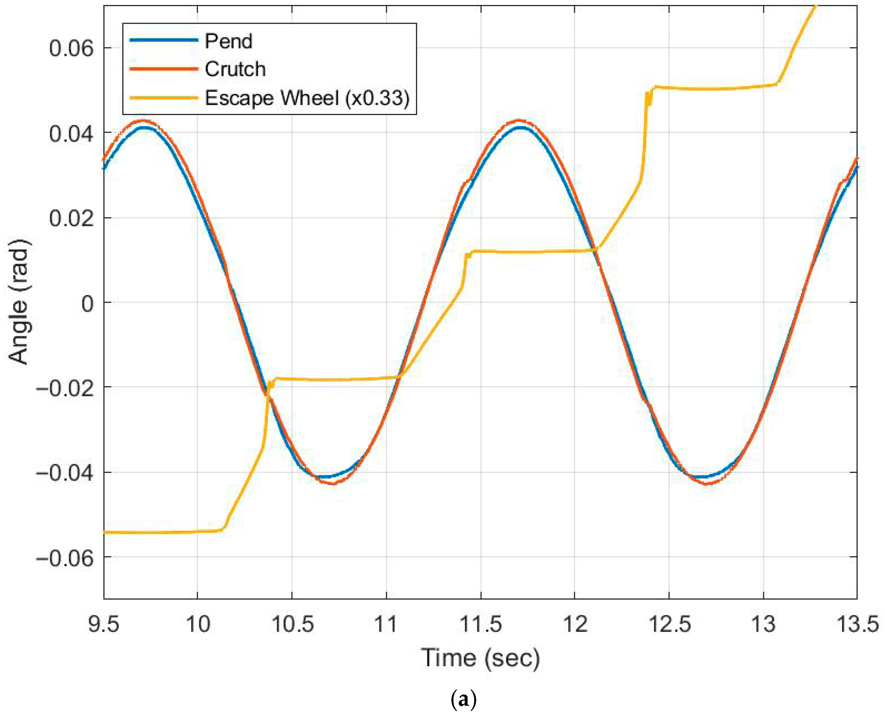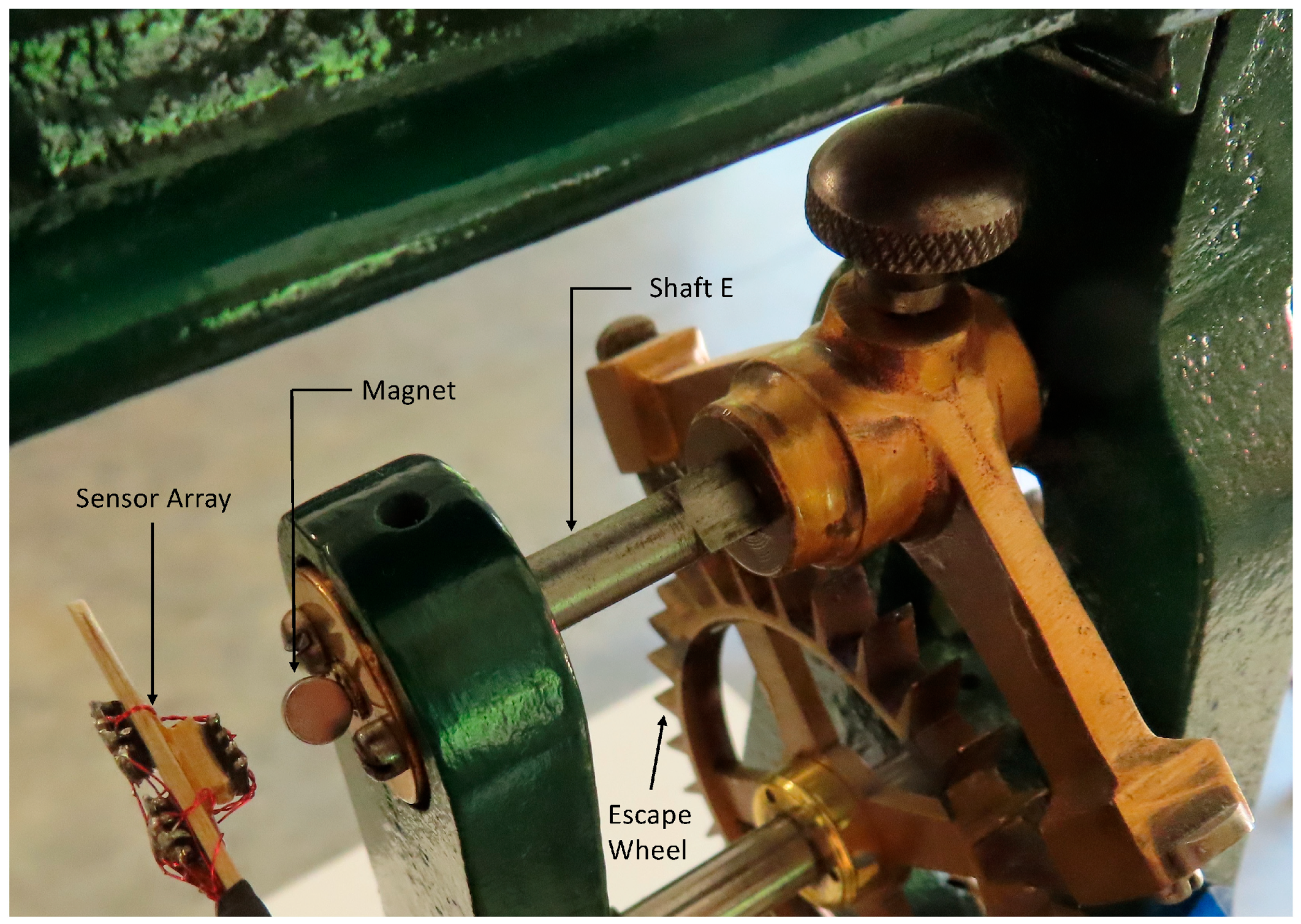 - Wagner, J.; Huey, C.; Knaub, K.; Volk, E.; Jagarwal, A. Modeling and Analysis of a Weight Driven Mechanical Tower Clock. In American Controls Conference, Baltimore, MD, USA, 30 June–2 July 2010; WeA18.3; IEEE: New York, NY, USA, 2010. [Google Scholar]