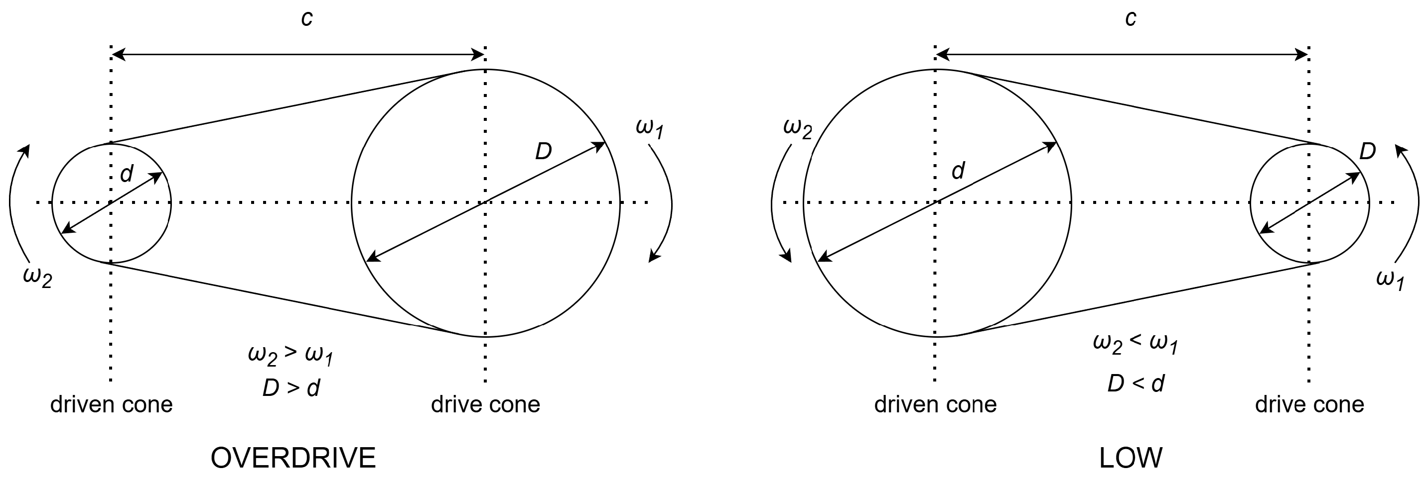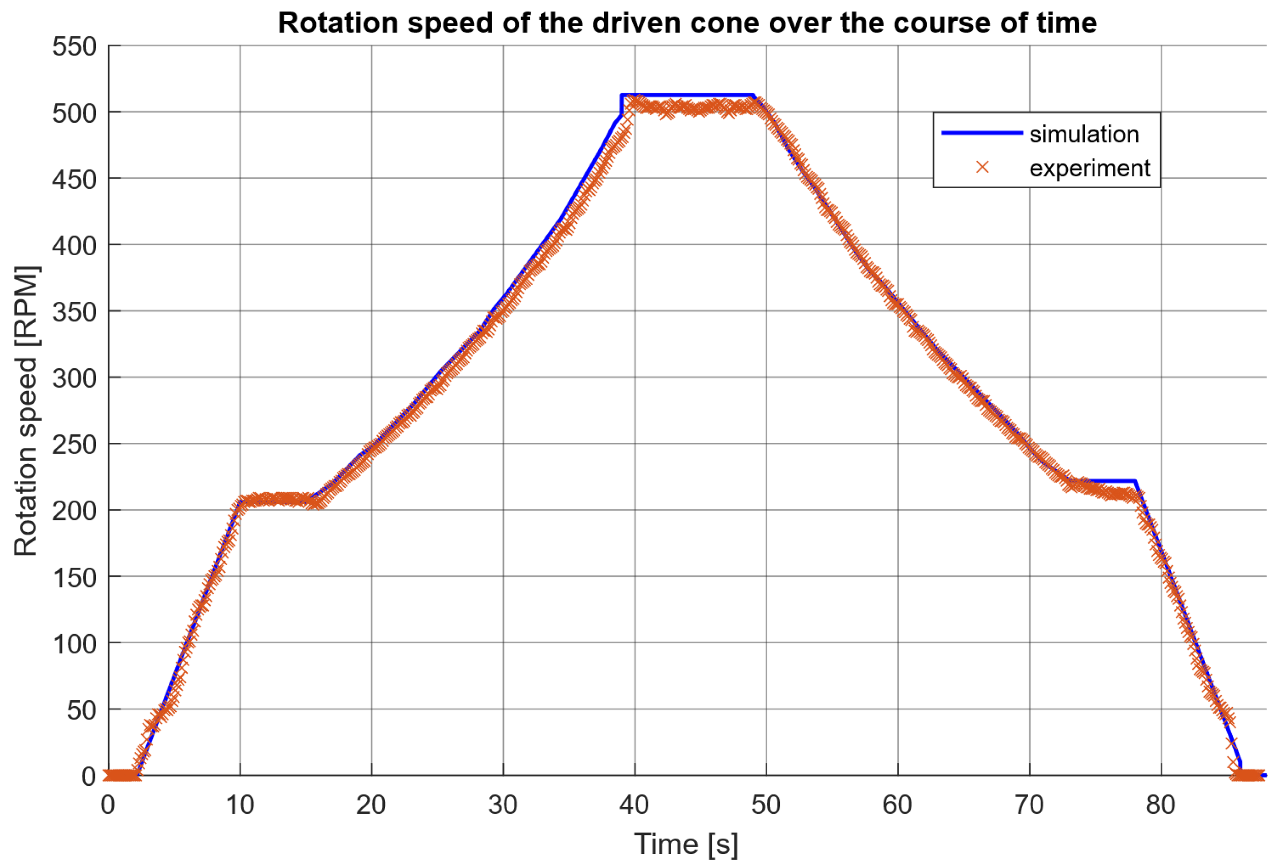 - Ideal geometry: The contact between the round belt and the cones is simplified to a mean-radius line contact. This omission of the ’seating’ effect (belt thickness compensation) is justified by the high correlation between the simulation results and empirical measurements.