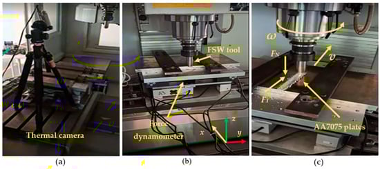 FSW process images: (a) Thermal camera for temperature measurement, (b) coordinate system, (c) axial and tangential forces.