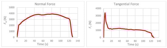 The thrust force (normal force) and feed force (tangential force) were measured using a two-axis dynamometer. Prior to the measurements, the dynamometer was calibrated and its repeatability was assessed. The thrust force was generated by providing a vertical plunge depth after the processing pin was zeroed on the workpiece. The resulting force-time graphs for a single specimen are shown in Figure 2.