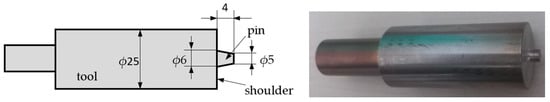 The taper cylindrical pinned stirring tool used during the FSW process was manufactured from stainless steel. The geometry and an image of the tool are presented in Figure 4.
